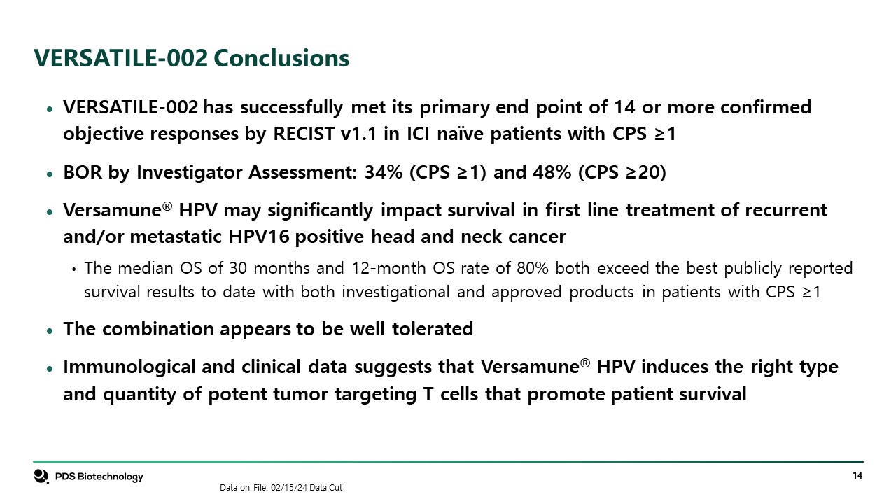 VERSATILE-002 Conclusions  VERSATILE-002 has successfully met its primary end point of 14 or more confirmed objective responses by RECIST v1.1 in ICI naïve patients with CPS ≥1  BOR by Investigator Assessment: 34% (CPS ≥1) and 48% (CPS ≥20)  Versamune® HPV may significantly impact survival in first line treatment of recurrent and/or metastatic HPV16 positive head and neck cancer  The median OS of 30 months and 12-month OS rate of 80% both exceed the best publicly reported survival results to date with both investigational and approved products in patients with CPS ≥1  The combination appears to be well tolerated  Immunological and clinical data suggests that Versamune® HPV induces the right type and quantity of potent tumor targeting T cells that promote patient survival  Data on File. 02/15/24 Data Cut