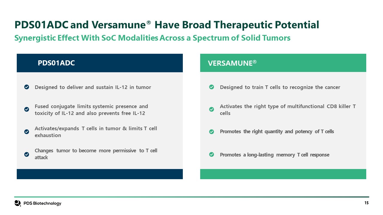 Synergistic Effect With SoC Modalities Across a Spectrum of Solid Tumors  PDS01ADC and Versamune® Have Broad Therapeutic Potential  PDS01ADC  VERSAMUNE®  Designed to deliver and sustain IL-12 in tumor  Fused conjugate limits systemic presence and toxicity of IL-12 and also prevents free IL-12  Activates/expands T cells in tumor & limits T cell exhaustion  Changes tumor to become more permissive to T cell attack  Designed to train T cells to recognize the cancer  Activates the right type of multifunctional CD8 killer T cells  Promotes a long-lasting memory T cell response  Promotes the right quantity and potency of T cells