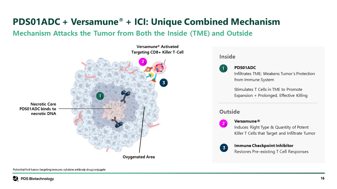 Mechanism Attacks the Tumor from Both the Inside (TME) and Outside  Potential first tumor-targeting immuno-cytokine antibody drug conjugate  PDS01ADC + Versamune® + ICI: Unique Combined Mechanism  Necrotic Core PDS01ADC binds to necrotic DNA  Versamune® Activated Targeting CD8+ Killer T-Cell  Oxygenated Area  Inside  PDS01ADC  Infiltrates TME; Weakens Tumor’s Protection from Immune System  Stimulates T Cells in TME to Promote Expansion + Prolonged, Effective Killing  Outside  Versamune®  Induces Right Type & Quantity of Potent Killer T Cells that Target and Infiltrate Tumor  Immune Checkpoint Inhibitor  Restores Pre-existing T Cell Responses