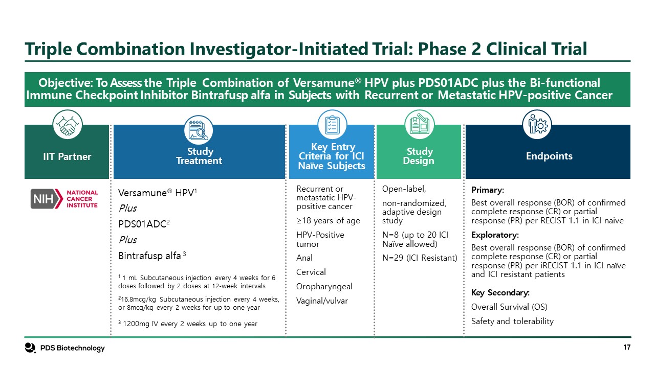 Triple Combination Investigator-Initiated Trial: Phase 2 Clinical Trial  Objective: To Assess the Triple Combination of Versamune® HPV plus PDS01ADC plus the Bi-functional Immune Checkpoint Inhibitor Bintrafusp alfa in Subjects with Recurrent or Metastatic HPV-positive Cancer  IIT Partner  StudyDesign  Open-label,  non-randomized, adaptive design study  N=8 (up to 20 ICI Naïve allowed)  N=29 (ICI Resistant)  Key Entry Criteria for ICI Naïve Subjects  Recurrent or metastatic HPV-positive cancer  ≥18 years of age  HPV-Positive tumor  Anal  Cervical  Oropharyngeal  Vaginal/vulvar  Versamune® HPV1  Plus  PDS01ADC2  Plus  Bintrafusp alfa 3      1 1 mL Subcutaneous injection every 4 weeks for 6 doses followed by 2 doses at 12-week intervals  216.8mcg/kg Subcutaneous injection every 4 weeks, or 8mcg/kg every 2 weeks for up to one year  3 1200mg IV every 2 weeks up to one year  Study Treatment  Primary:  Best overall response (BOR) of confirmed complete response (CR) or partial response (PR) per RECIST 1.1 in ICI naive  Key Secondary:  Overall Survival (OS)  Safety and tolerability  Endpoints  Exploratory:  Best overall response (BOR) of confirmed complete response (CR) or partial response (PR) per iRECIST 1.1 in ICI naïve and ICI resistant patients