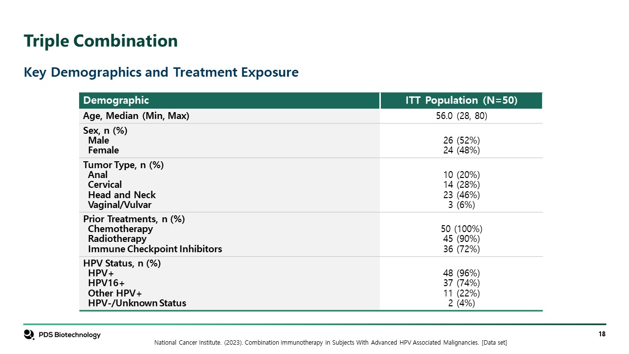 Triple Combination  Key Demographics and Treatment Exposure  National Cancer Institute. (2023). Combination Immunotherapy in Subjects With Advanced HPV Associated Malignancies. [Data set]  Demographic  ITT Population (N=50)  Age, Median (Min, Max)  56.0 (28, 80)  Sex, n (%)  Male  Female     26 (52%)  24 (48%)  Tumor Type, n (%)  Anal  Cervical  Head and Neck  Vaginal/Vulvar     10 (20%)  14 (28%)  23 (46%)  3 (6%)  Prior Treatments, n (%)  Chemotherapy  Radiotherapy  Immune Checkpoint Inhibitors     50 (100%)  45 (90%)  36 (72%)  HPV Status, n (%)  HPV+  HPV16+  Other HPV+  HPV-/Unknown Status     48 (96%)  37 (74%)  11 (22%)  2 (4%)