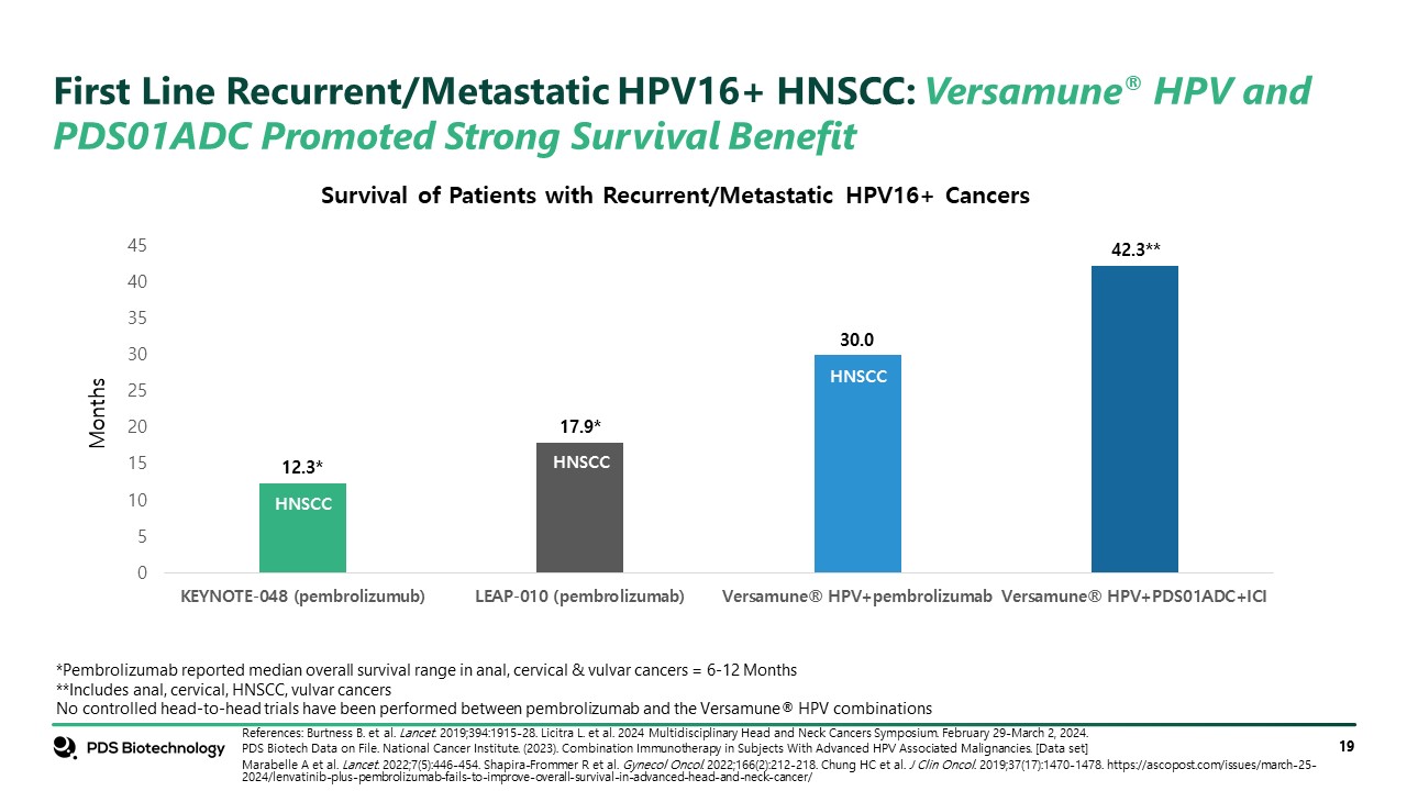 First Line Recurrent/Metastatic HPV16+ HNSCC: Versamune® HPV and PDS01ADC Promoted Strong Survival Benefit  References: Burtness B. et al. Lancet. 2019;394:1915-28. Licitra L. et al. 2024 Multidisciplinary Head and Neck Cancers Symposium. February 29-March 2, 2024.  PDS Biotech Data on File. National Cancer Institute. (2023). Combination Immunotherapy in Subjects With Advanced HPV Associated Malignancies. [Data set]  Marabelle A et al. Lancet. 2022;7(5):446-454. Shapira-Frommer R et al. Gynecol Oncol. 2022;166(2):212-218. Chung HC et al. J Clin Oncol. 2019;37(17):1470-1478. https://ascopost.com/issues/march-25-2024/lenvatinib-plus-pembrolizumab-fails-to-improve-overall-survival-in-advanced-head-and-neck-cancer/  *Pembrolizumab reported median overall survival range in anal, cervical & vulvar cancers = 6-12 Months  **Includes anal, cervical, HNSCC, vulvar cancers  No controlled head-to-head trials have been performed between pembrolizumab and the Versamune® HPV combinations  Survival of Patients with Recurrent/Metastatic HPV16+ Cancers  HNSCC  HNSCC  HNSCC  12.3*  Months  17.9*  30.0  42.3**