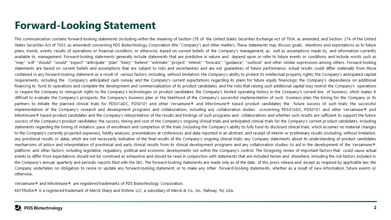 Forward-Looking Statement  This communication contains forward-looking statements (including within the meaning of Section 27E of the United States Securities Exchange Act of 7934, as amended, and Section 27A of the United States Securities Act of 7933, as amended) concerning PDS Biotechnology Corporation (the "Company") and other matters. These statements may discuss goals, intentions and expectations as to future plans, trends, events, results of operations or financial condition, or otherwise, based on current beliefs of the Company's management, as well as assumptions made by, and information currently available to, management. Forward-looking statements generally include statements that are predictive in nature and depend upon or refer to future events or conditions and include words such as "may" "will" "should" "would" "expect" "anticipate" "plan" "likely" "believe" "estimate" "project“ "intend," "forecast," "guidance", "outlook" and other similar expressions among others. Forward-looking statements are based on current beliefs and assumptions that are subject to risks and uncertainties and are not guarantees of future performance. Actual results could differ materially from those contained in any forward-looking statement as a result of various factors, including, without limitation: the Company's ability to protect its intellectual property rights; the Company's anticipated capital requirements, including the Company's anticipated cash runway and the Company's current expectations regarding its plans for future equity financings; the Company's dependence on additional financing to fund its operations and complete the development and commercialization of its product candidates, and the risks that raising such additional capital may restrict the Company's operations or require the Company to relinquish rights to the Company's technologies or product candidates; the Company's limited operating history in the Company's current line of business, which makes it difficult to evaluate the Company's prospects, the Company's business plan or the likelihood of the Company's successful implementation of such business plan; the timing for the Company or its partners to initiate the planned clinical trials for PDS01ADC, PDS0101 and other Versamune® and lnfectimune® based product candidates; the future success of such trials; the successful implementation of the Company's research and development programs and collaborations, including any collaboration studies concerning PDS01ADC, PDS0101 and other Versamune® and lnfectimune® based product candidates and the Company's interpretation of the results and findings of such programs and collaborations and whether such results are sufficient to support the future success of the Company's product candidates; the success, timing and cost of the Company's ongoing clinical trials and anticipated clinical trials for the Company's current product candidates, including statements regarding the timing of initiation, pace of enrollment and completion of the trials (including the Company's ability to fully fund its disclosed clinical trials, which assumes no material changes to the Company's currently projected expenses), futility analyses, presentations at conferences and data reported in an abstract, and receipt of interim or preliminary results (including, without limitation, any preclinical results or data), which are not necessarily indicative of the final results of the Company's ongoing clinical trials; any Company statements about its understanding of product candidates mechanisms of action and interpretation of preclinical and early clinical results from its clinical development programs and any collaboration studies; to aid in the development of the Versamune® platform; and other factors, including legislative, regulatory, political and economic developments not within the Company's control. The foregoing review of important factors that could cause actual events to differ from expectations should not be construed as exhaustive and should be read in conjunction with statements that are included herein and elsewhere, including the risk factors included in the Company's annual, quarterly and periodic reports filed with the SEC. The forward-looking statements are made only as of the date of this press release and, except as required by applicable law, the Company undertakes no obligation to revise or update any forward-looking statement, or to make any other forward-looking statements, whether as a result of new information, future events or otherwise.  Versamune® and lnfectimune® are registered trademarks of PDS Biotechnology Corporation.  KEYTRUDA® is a registered trademark of Merck Sharp and Dohme LLC, a subsidiary of Merck & Co., Inc., Rahway, NJ, USA.