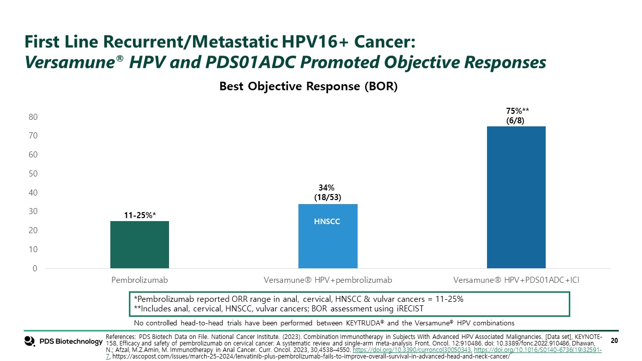 First Line Recurrent/Metastatic HPV16+ Cancer: Versamune® HPV and PDS01ADC Promoted Objective Responses  References: PDS Biotech Data on File. National Cancer Institute. (2023). Combination Immunotherapy in Subjects With Advanced HPV Associated Malignancies. [Data set], KEYNOTE-158, Efficacy and safety of pembrolizumab on cervical cancer: A systematic review and single-arm meta-analysis Front. Oncol. 12:910486. doi: 10.3389/fonc.2022.910486, Dhawan, N.; Afzal, M.Z.Amin, M. Immunotherapy in Anal Cancer. Curr. Oncol. 2023, 30,4538–4550. https://doi.org/10.3390/curroncol30050343, https://doi.org/10.1016/S0140-6736(19)32591-7, https://ascopost.com/issues/march-25-2024/lenvatinib-plus-pembrolizumab-fails-to-improve-overall-survival-in-advanced-head-and-neck-cancer/  34%   (18/53)  75%**  (6/8)  No controlled head-to-head trials have been performed between KEYTRUDA® and the Versamune® HPV combinations  Best Objective Response (BOR)  11-25%*  *Pembrolizumab reported ORR range in anal, cervical, HNSCC & vulvar cancers = 11-25%  **Includes anal, cervical, HNSCC, vulvar cancers; BOR assessment using iRECIST  HNSCC