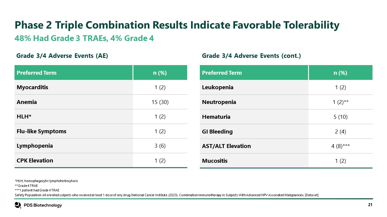 Phase 2 Triple Combination Results Indicate Favorable Tolerability  48% Had Grade 3 TRAEs, 4% Grade 4  Preferred Term  n (%)  Myocarditis  1 (2)  Anemia  15 (30)   HLH*  1 (2)  Flu-like Symptoms  1 (2)  Lymphopenia  3 (6)  CPK Elevation  1 (2)  Preferred Term  n (%)  Leukopenia  1 (2)  Neutropenia  1 (2)**  Hematuria  5 (10)  GI Bleeding  2 (4)  AST/ALT Elevation  4 (8)***  Mucositis  1 (2)  Grade 3/4 Adverse Events (AE)   Grade 3/4 Adverse Events (cont.)   *HLH, hemophagocytic lymphohistiocytosis  **Grade 4 TRAE  ***1 patient had Grade 4 TRAE  Safety Population: All enrolled subjects who received at least 1 dose of any drug. National Cancer Institute. (2023). Combination Immunotherapy in Subjects With Advanced HPV Associated Malignancies. [Data set]