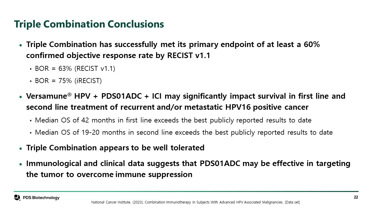 Triple Combination Conclusions  Triple Combination has successfully met its primary endpoint of at least a 60% confirmed objective response rate by RECIST v1.1  BOR = 63% (RECIST v1.1)  BOR = 75% (iRECIST)  Versamune® HPV + PDS01ADC + ICI may significantly impact survival in first line and second line treatment of recurrent and/or metastatic HPV16 positive cancer  Median OS of 42 months in first line exceeds the best publicly reported results to date  Median OS of 19-20 months in second line exceeds the best publicly reported results to date  Triple Combination appears to be well tolerated   Immunological and clinical data suggests that PDS01ADC may be effective in targeting the tumor to overcome immune suppression  National Cancer Institute. (2023). Combination Immunotherapy in Subjects With Advanced HPV Associated Malignancies. [Data set]