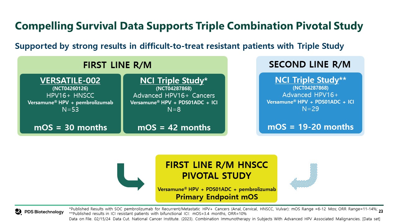 Compelling Survival Data Supports Triple Combination Pivotal Study  Supported by strong results in difficult-to-treat resistant patients with Triple Study  VERSATILE-002  (NCT04260126)   HPV16+ HNSCC  Versamune® HPV + pembrolizumab  N=53  mOS = 30 months  NCI Triple Study*  (NCT04287868)   Advanced HPV16+ Cancers  Versamune® HPV + PDS01ADC + ICI  N=8  mOS = 42 months  FIRST LINE R/M  SECOND LINE R/M  NCI Triple Study**  (NCT04287868)   Advanced HPV16+  Versamune® HPV + PDS01ADC + ICI  N=29  mOS = 19-20 months  Versamune® HPV + PDS01ADC + pembrolizumab  Primary Endpoint mOS  FIRST LINE R/M HNSCC  PIVOTAL STUDY  *Published Results with SOC pembrolizumab for Recurrent/Metastatic HPV+ Cancers (Anal, Cervical, HNSCC, Vulvar): mOS Range =6-12 Mos; ORR Range=11-14%; **Published results in ICI resistant patients with bifunctional ICI: mOS=3.4 months, ORR=10%  Data on File. 02/15/24 Data Cut. National Cancer Institute. (2023). Combination Immunotherapy in Subjects With Advanced HPV Associated Malignancies. [Data set]