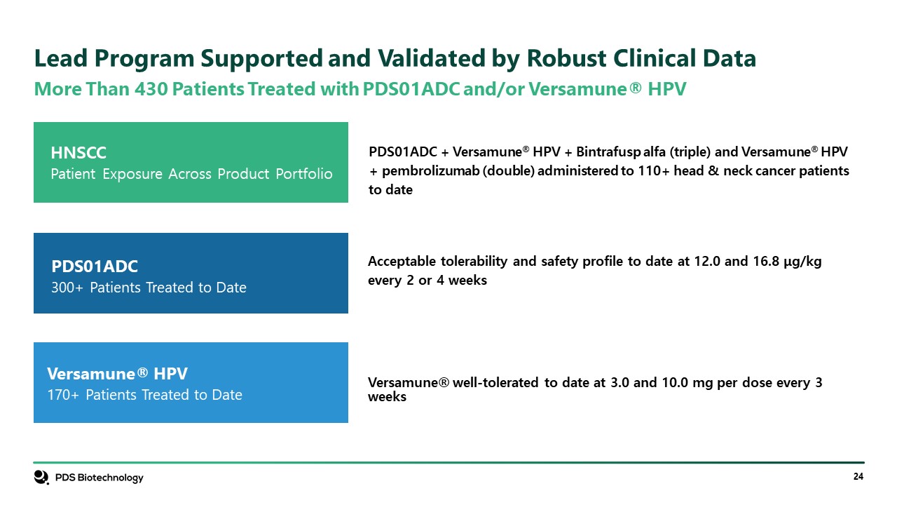 More Than 430 Patients Treated with PDS01ADC and/or Versamune® HPV  Lead Program Supported and Validated by Robust Clinical Data  PDS01ADC  300+ Patients Treated to Date  HNSCC   Patient Exposure Across Product Portfolio  PDS01ADC + Versamune® HPV + Bintrafusp alfa (triple) and Versamune® HPV + pembrolizumab (double) administered to 110+ head & neck cancer patients to date  Acceptable tolerability and safety profile to date at 12.0 and 16.8 μg/kg every 2 or 4 weeks  Versamune® well-tolerated to date at 3.0 and 10.0 mg per dose every 3 weeks  Versamune® HPV  170+ Patients Treated to Date