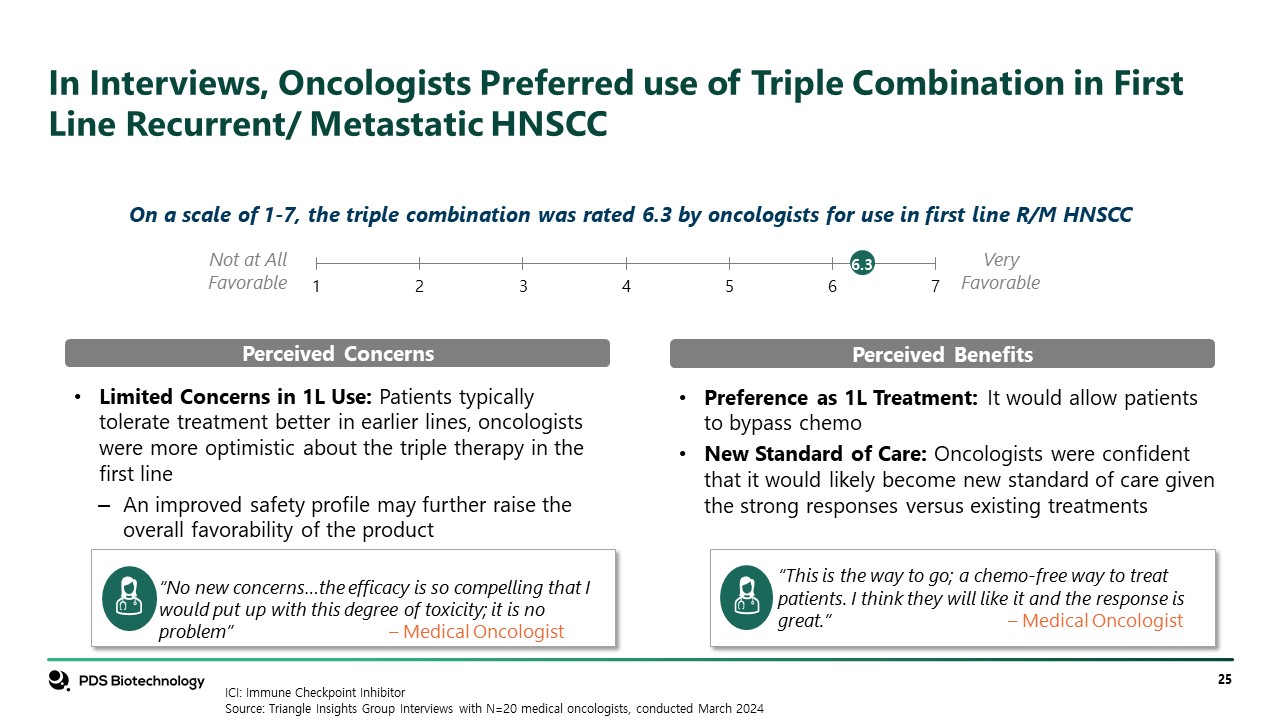 In Interviews, Oncologists Preferred use of Triple Combination in First Line Recurrent/ Metastatic HNSCC  ICI: Immune Checkpoint Inhibitor  Source: Triangle Insights Group Interviews with N=20 medical oncologists, conducted March 2024  On a scale of 1-7, the triple combination was rated 6.3 by oncologists for use in first line R/M HNSCC  Not at All Favorable  Very  Favorable  Preference as 1L Treatment: It would allow patients to bypass chemo  New Standard of Care: Oncologists were confident that it would likely become new standard of care given the strong responses versus existing treatments  “This is the way to go; a chemo-free way to treat patients. I think they will like it and the response is great.” – Medical Oncologist  Perceived Benefits  Perceived Concerns  “No new concerns…the efficacy is so compelling that I would put up with this degree of toxicity; it is no problem” – Medical Oncologist  Limited Concerns in 1L Use: Patients typically tolerate treatment better in earlier lines, oncologists were more optimistic about the triple therapy in the first line  An improved safety profile may further raise the overall favorability of the product