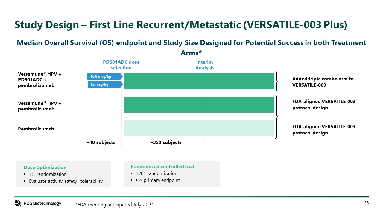 Study Design – First Line Recurrent/Metastatic (VERSATILE-003 Plus)  Dose Optimization  1:1 randomization  Evaluate activity, safety, tolerability  Randomized controlled trial  1:1:1 randomization  OS primary endpoint  Interim  Analysis  Versamune® HPV + PDS01ADC + pembrolizumab  ~40 subjects  ~350 subjects  PDS01ADC dose selection  Versamune® HPV + pembrolizumab  Pembrolizumab  FDA-aligned VERSATILE-003 protocol design  Added triple combo arm to VERSATILE-003  Median Overall Survival (OS) endpoint and Study Size Designed for Potential Success in both Treatment Arms*  16.8 mcg/kg  12 mcg/kg  FDA-aligned VERSATILE-003 protocol design  *FDA meeting anticipated July 2024