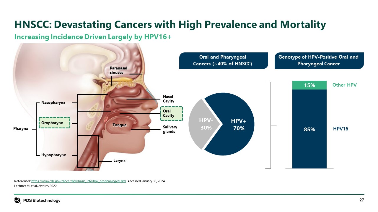 Increasing Incidence Driven Largely by HPV16+  References: https://www.cdc.gov/cancer/hpv/basic_info/hpv_oropharyngeal.htm. Accessed January 30, 2024.   Lechner M. et al. Nature. 2022  HNSCC: Devastating Cancers with High Prevalence and Mortality  Oral and PharyngealCancers (~40% of HNSCC)  Paranasalsinuses  Nasopharynx  Oropharynx  Hypopharynx  Larynx  Pharynx  Tongue  Salivaryglands  OralCavity  NasalCavity  Genotype of HPV-Positive Oral and Pharyngeal Cancer
