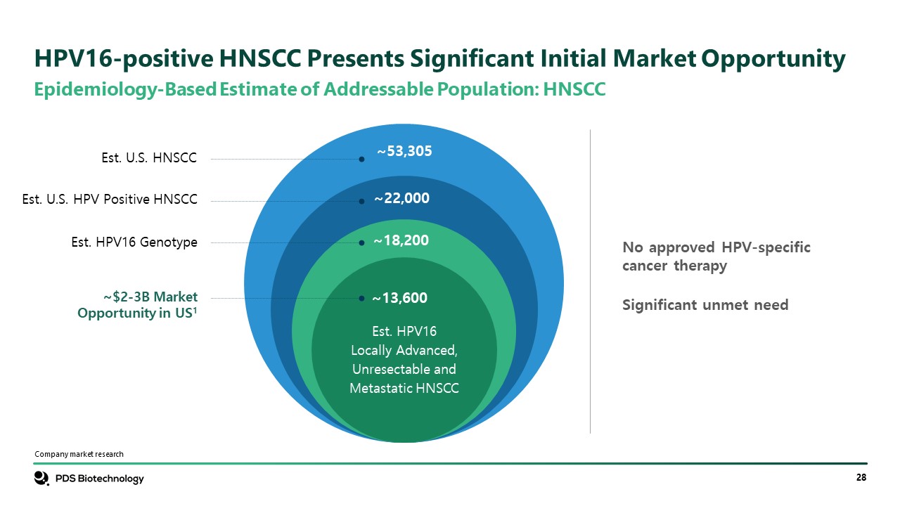 Epidemiology-Based Estimate of Addressable Population: HNSCC  Company market research  HPV16-positive HNSCC Presents Significant Initial Market Opportunity  No approved HPV-specific cancer therapy  Significant unmet need  Est. HPV16Locally Advanced,Unresectable andMetastatic HNSCC  ~13,600  ~18,200  ~22,000  ~53,305  Est. U.S. HNSCC  Est. U.S. HPV Positive HNSCC  Est. HPV16 Genotype  ~$2-3B Market Opportunity in US1