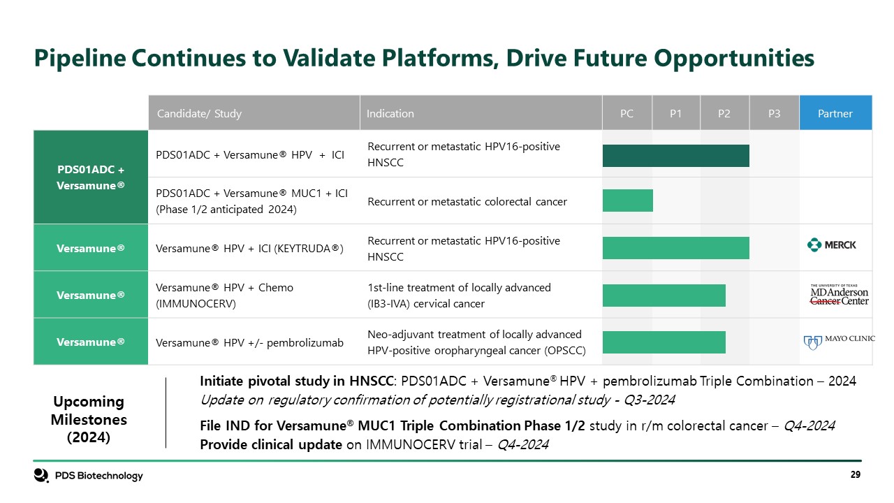 Candidate/ Study   Indication  PC  P1  P2  P3  Partner  PDS01ADC + Versamune®  PDS01ADC + Versamune® HPV + ICI   Recurrent or metastatic HPV16-positive HNSCC  PDS01ADC + Versamune® MUC1 + ICI (Phase 1/2 anticipated 2024)  Recurrent or metastatic colorectal cancer  Versamune®  Versamune® HPV + ICI (KEYTRUDA®)  Recurrent or metastatic HPV16-positive HNSCC  Versamune®  Versamune® HPV + Chemo (IMMUNOCERV)  1st-line treatment of locally advanced(IB3-IVA) cervical cancer  Versamune®  Versamune® HPV +/- pembrolizumab   Neo-adjuvant treatment of locally advanced HPV-positive oropharyngeal cancer (OPSCC)  Pipeline Continues to Validate Platforms, Drive Future Opportunities  Initiate pivotal study in HNSCC: PDS01ADC + Versamune® HPV + pembrolizumab Triple Combination – 2024  Update on regulatory confirmation of potentially registrational study - Q3-2024  Upcoming Milestones (2024)  File IND for Versamune® MUC1 Triple Combination Phase 1/2 study in r/m colorectal cancer – Q4-2024  Provide clinical update on IMMUNOCERV trial – Q4-2024