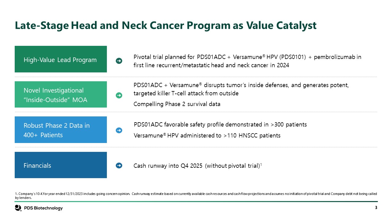 Late-Stage Head and Neck Cancer Program as Value Catalyst  1. Company’s 10-K for year ended 12/31/2023 includes going concern opinion. Cash runway estimate based on currently available cash resources and cash flow projections and assumes no initiation of pivotal trial and Company debt not being called by lenders.  High-Value Lead Program  Novel Investigational “Inside-Outside” MOA   Robust Phase 2 Data in 400+ Patients   Financials  Pivotal trial planned for PDS01ADC + Versamune® HPV (PDS0101) + pembrolizumab in first line recurrent/metastatic head and neck cancer in 2024  PDS01ADC + Versamune® disrupts tumor’s inside defenses, and generates potent, targeted killer T-cell attack from outside   Compelling Phase 2 survival data  PDS01ADC favorable safety profile demonstrated in >300 patients  Versamune® HPV administered to >110 HNSCC patients  Cash runway into Q4 2025 (without pivotal trial)1