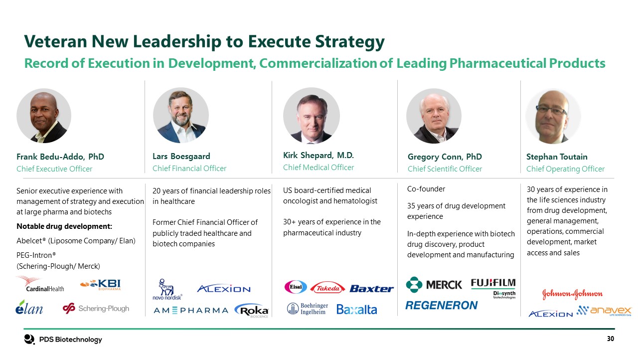 Record of Execution in Development, Commercialization of Leading Pharmaceutical Products  Veteran New Leadership to Execute Strategy  Senior executive experience with management of strategy and execution at large pharma and biotechs  Notable drug development:   Abelcet® (Liposome Company/ Elan)  PEG-Intron® (Schering-Plough/ Merck)  Frank Bedu-Addo, PhD  Chief Executive Officer  20 years of financial leadership rolesin healthcare  Former Chief Financial Officer of publicly traded healthcare andbiotech companies  Lars Boesgaard  Chief Financial Officer  US board-certified medicaloncologist and hematologist  30+ years of experience in the pharmaceutical industry   Kirk Shepard, M.D.  Chief Medical Officer  Co-founder  35 years of drug development experience   In-depth experience with biotechdrug discovery, productdevelopment and manufacturing  Gregory Conn, PhD  Chief Scientific Officer  Stephan Toutain  Chief Operating Officer  30 years of experience in the life sciences industry from drug development, general management, operations, commercial development, market access and sales