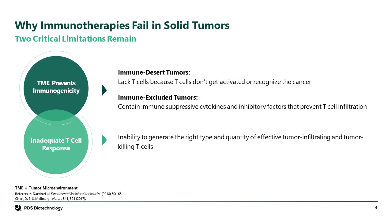 Two Critical Limitations Remain  References: Darvin et al. Experimental & Molecular Medicine (2018) 50:165.   Chen, D. S. & Mellman, I. Nature 541, 321 (2017).  Why Immunotherapies Fail in Solid Tumors  Immune-Desert Tumors:   Lack T cells because T cells don’t get activated or recognize the cancer   Immune-Excluded Tumors:   Contain immune suppressive cytokines and inhibitory factors that prevent T cell infiltration  TME = Tumor Microenvironment  TME Prevents Immunogenicity   Inability to generate the right type and quantity of effective tumor-infiltrating and tumor-killing T cells  Inadequate T Cell Response