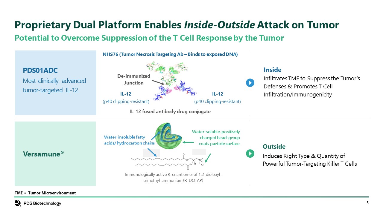 Potential to Overcome Suppression of the T Cell Response by the Tumor  TME = Tumor Microenvironment  Proprietary Dual Platform Enables Inside-Outside Attack on Tumor  NHS76 (Tumor Necrosis Targeting Ab – Binds to exposed DNA)  De-immunized Junction  IL-12  (p40 clipping-resistant)  IL-12  (p40 clipping-resistant)  IL-12 fused antibody drug conjugate  Water-insoluble fatty acids/ hydrocarbon chains  Water-soluble, positively charged head-group coats particle surface  Immunologically active R-enantiomer of 1,2-dioleoyl-trimethyl-ammonium (R-DOTAP)  Inside  Infiltrates TME to Suppress the Tumor’s Defenses & Promotes T Cell Infiltration/Immunogenicity  Outside  PDS01ADC   Most clinically advanced tumor-targeted IL-12  Versamune®  Outside  Induces Right Type & Quantity of Powerful Tumor-Targeting Killer T Cells
