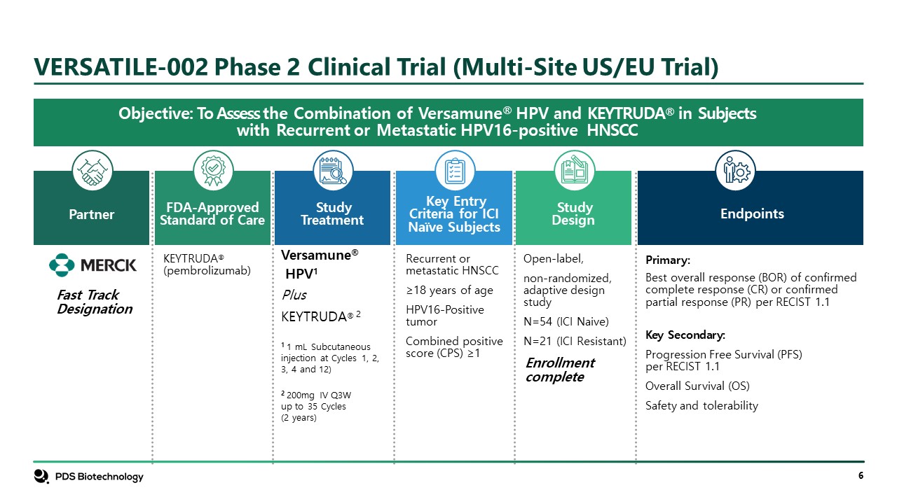 VERSATILE-002 Phase 2 Clinical Trial (Multi-Site US/EU Trial)  Objective: To Assess the Combination of Versamune® HPV and KEYTRUDA® in Subjects with Recurrent or Metastatic HPV16-positive HNSCC  KEYTRUDA®(pembrolizumab)  FDA-Approved Standard of Care  Partner  StudyDesign  Open-label,  non-randomized, adaptive design study  N=54 (ICI Naive)  N=21 (ICI Resistant)  Enrollment complete  Key Entry Criteria for ICI Naïve Subjects  Recurrent or metastatic HNSCC  ≥18 years of age  HPV16-Positive tumor  Combined positive score (CPS) ≥1  Versamune®   HPV1  Plus  KEYTRUDA® 2      1 1 mL Subcutaneous injection at Cycles 1, 2, 3, 4 and 12)  2 200mg IV Q3W up to 35 Cycles (2 years)  Study Treatment  Primary:  Best overall response (BOR) of confirmed complete response (CR) or confirmed partial response (PR) per RECIST 1.1  Key Secondary:  Progression Free Survival (PFS) per RECIST 1.1   Overall Survival (OS)  Safety and tolerability  Endpoints  Fast Track Designation