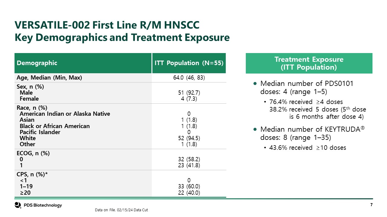 VERSATILE-002 First Line R/M HNSCCKey Demographics and Treatment Exposure  Demographic  ITT Population (N=55)  Age, Median (Min, Max)  64.0 (46, 83)  Sex, n (%)  Male  Female     51 (92.7)  4 (7.3)  Race, n (%)  American Indian or Alaska Native  Asian  Black or African American  Pacific Islander  White  Other     0  1 (1.8)  1 (1.8)  0  52 (94.5)  1 (1.8)  ECOG, n (%)  0  1     32 (58.2)  23 (41.8)  CPS, n (%)*  <1  1–19  ≥20     0  33 (60.0)  22 (40.0)  Treatment Exposure(ITT Population)  Median number of PDS0101 doses: 4 (range 1–5)  76.4% received ≥4 doses38.2% received 5 doses (5th dose is 6 months after dose 4)  Median number of KEYTRUDA® doses: 8 (range 1–35)  43.6% received ≥10 doses  Data on File. 02/15/24 Data Cut