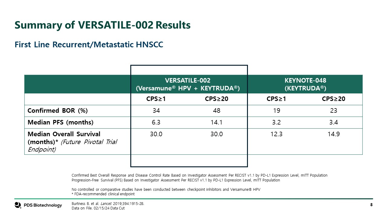 Summary of VERSATILE-002 Results  First Line Recurrent/Metastatic HNSCC  VERSATILE-002   (Versamune® HPV + KEYTRUDA®)  KEYNOTE-048  (KEYTRUDA®)  CPS≥1  CPS≥20  CPS≥1  CPS≥20  Confirmed BOR (%)  34  48  19  23  Median PFS (months)  6.3  14.1  3.2  3.4  Median Overall Survival (months)* (Future Pivotal Trial Endpoint)  30.0  30.0  12.3  14.9  Confirmed Best Overall Response and Disease Control Rate Based on Investigator Assessment Per RECIST v1.1 by PD-L1 Expression Level, mITT Population  Progression-Free Survival (PFS) Based on Investigator Assessment Per RECIST v1.1 by PD-L1 Expression Level, mITT Population  No controlled or comparative studies have been conducted between checkpoint inhibitors and Versamune® HPV  * FDA-recommended clinical endpoint   Burtness B. et al. Lancet. 2019;394:1915-28.   Data on File. 02/15/24 Data Cut