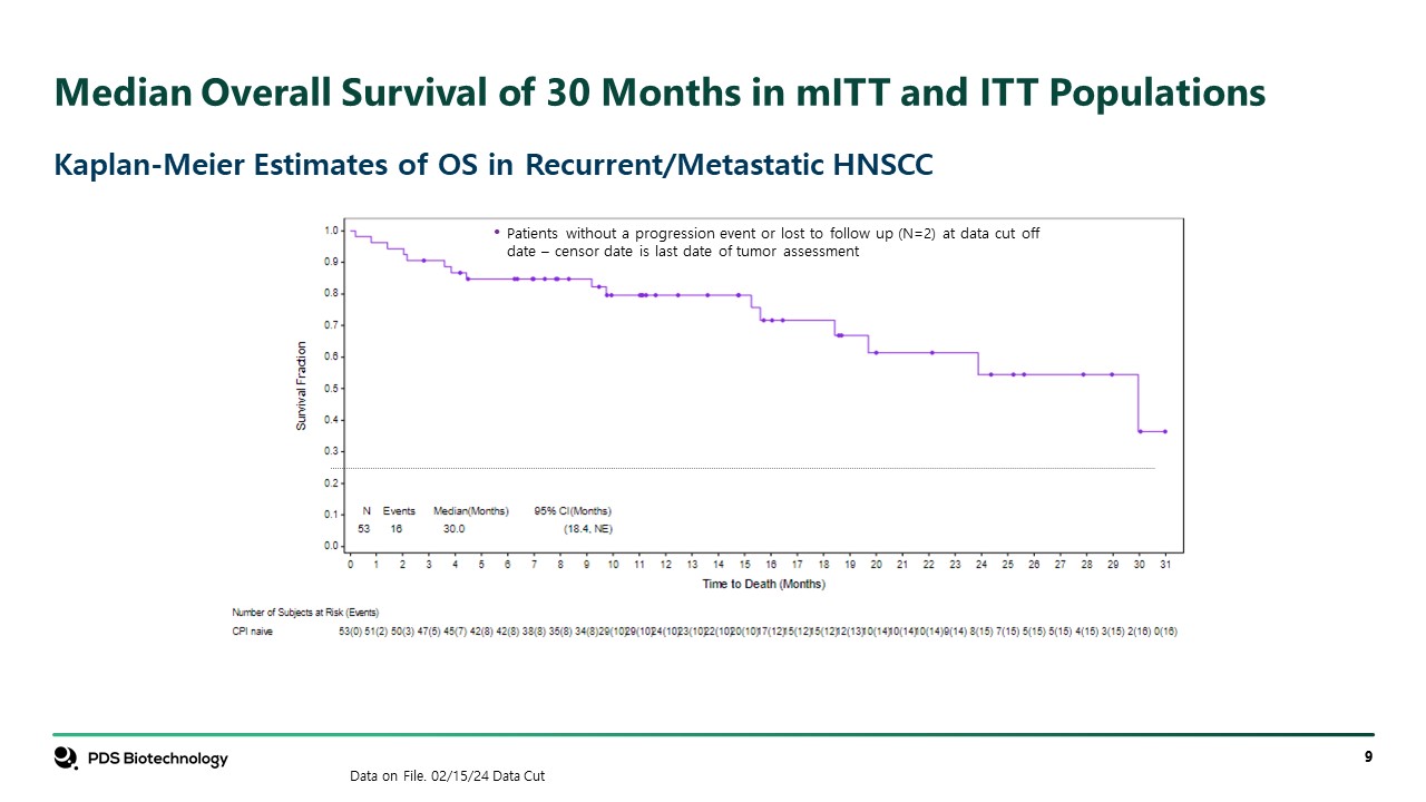 Median Overall Survival of 30 Months in mITT and ITT Populations  Kaplan-Meier Estimates of OS in Recurrent/Metastatic HNSCC  Data on File. 02/15/24 Data Cut  Patients without a progression event or lost to follow up (N=2) at data cut off date – censor date is last date of tumor assessment