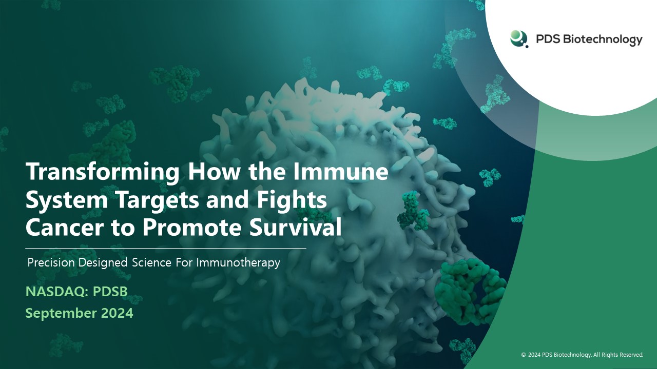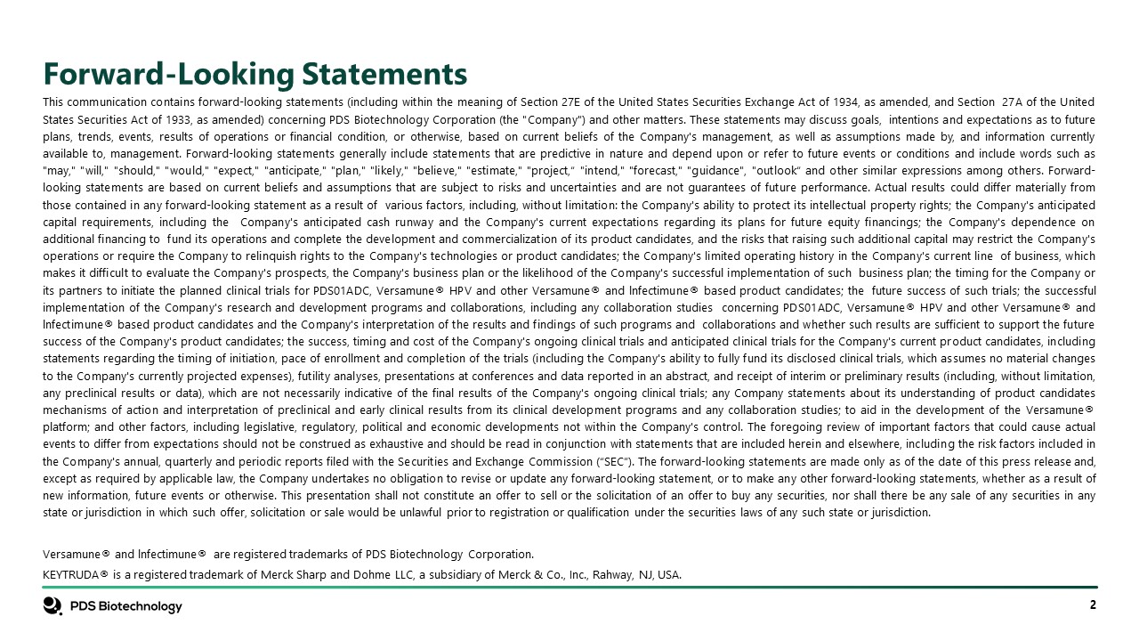 Forward-Looking Statements  This communication contains forward-looking statements (including within the meaning of Section 27E of the United States Securities Exchange Act of 1934, as amended, and Section 27A of the United States Securities Act of 1933, as amended) concerning PDS Biotechnology Corporation (the "Company") and other matters. These statements may discuss goals, intentions and expectations as to future plans, trends, events, results of operations or financial condition, or otherwise, based on current beliefs of the Company's management, as well as assumptions made by, and information currently available to, management. Forward-looking statements generally include statements that are predictive in nature and depend upon or refer to future events or conditions and include words such as "may," "will," "should," "would," "expect," "anticipate," "plan," "likely," "believe," "estimate," "project,“ "intend," "forecast," "guidance", "outlook“ and other similar expressions among others. Forward-looking statements are based on current beliefs and assumptions that are subject to risks and uncertainties and are not guarantees of future performance. Actual results could differ materially from those contained in any forward-looking statement as a result of various factors, including, without limitation: the Company's ability to protect its intellectual property rights; the Company's anticipated capital requirements, including the Company's anticipated cash runway and the Company's current expectations regarding its plans for future equity financings; the Company's dependence on additional financing to fund its operations and complete the development and commercialization of its product candidates, and the risks that raising such additional capital may restrict the Company's operations or require the Company to relinquish rights to the Company's technologies or product candidates; the Company's limited operating history in the Company's current line of business, which makes it difficult to evaluate the Company's prospects, the Company's business plan or the likelihood of the Company's successful implementation of such business plan; the timing for the Company or its partners to initiate the planned clinical trials for PDS01ADC, Versamune® HPV and other Versamune® and lnfectimune® based product candidates; the future success of such trials; the successful implementation of the Company's research and development programs and collaborations, including any collaboration studies concerning PDS01ADC, Versamune® HPV and other Versamune® and lnfectimune® based product candidates and the Company's interpretation of the results and findings of such programs and collaborations and whether such results are sufficient to support the future success of the Company's product candidates; the success, timing and cost of the Company's ongoing clinical trials and anticipated clinical trials for the Company's current product candidates, including statements regarding the timing of initiation, pace of enrollment and completion of the trials (including the Company's ability to fully fund its disclosed clinical trials, which assumes no material changes to the Company's currently projected expenses), futility analyses, presentations at conferences and data reported in an abstract, and receipt of interim or preliminary results (including, without limitation, any preclinical results or data), which are not necessarily indicative of the final results of the Company's ongoing clinical trials; any Company statements about its understanding of product candidates mechanisms of action and interpretation of preclinical and early clinical results from its clinical development programs and any collaboration studies; to aid in the development of the Versamune® platform; and other factors, including legislative, regulatory, political and economic developments not within the Company's control. The foregoing review of important factors that could cause actual events to differ from expectations should not be construed as exhaustive and should be read in conjunction with statements that are included herein and elsewhere, including the risk factors included in the Company's annual, quarterly and periodic reports filed with the Securities and Exchange Commission (“SEC”). The forward-looking statements are made only as of the date of this press release and, except as required by applicable law, the Company undertakes no obligation to revise or update any forward-looking statement, or to make any other forward-looking statements, whether as a result of new information, future events or otherwise. This presentation shall not constitute an offer to sell or the solicitation of an offer to buy any securities, nor shall there be any sale of any securities in any state or jurisdiction in which such offer, solicitation or sale would be unlawful prior to registration or qualification under the securities laws of any such state or jurisdiction.  Versamune® and lnfectimune® are registered trademarks of PDS Biotechnology Corporation.  KEYTRUDA® is a registered trademark of Merck Sharp and Dohme LLC, a subsidiary of Merck & Co., Inc., Rahway, NJ, USA.