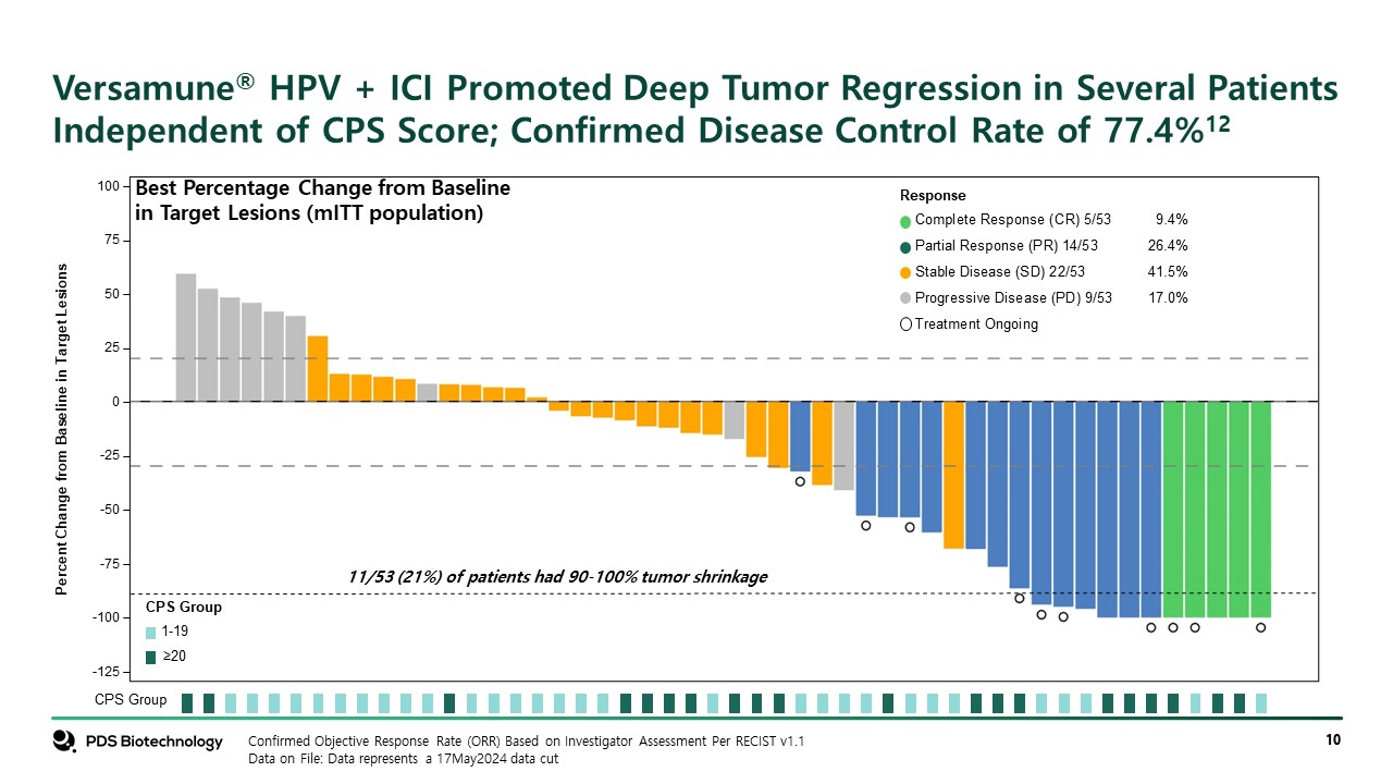 Percent Change from Baseline in Target Lesions  -50  -25  25  50  75  100  0  -75  -100  -125  CPS Group  1-19   ≥20  CPS Group  Response  Complete Response (CR) 5/53 9.4%  Partial Response (PR) 14/53 26.4%  Stable Disease (SD) 22/53 41.5%  Progressive Disease (PD) 9/53 17.0%   Treatment Ongoing   Confirmed Objective Response Rate (ORR) Based on Investigator Assessment Per RECIST v1.1  Data on File: Data represents a 17May2024 data cut  Best Percentage Change from Baseline in Target Lesions (mITT population)  11/53 (21%) of patients had 90-100% tumor shrinkage   Versamune® HPV + ICI Promoted Deep Tumor Regression in Several Patients Independent of CPS Score; Confirmed Disease Control Rate of 77.4%12