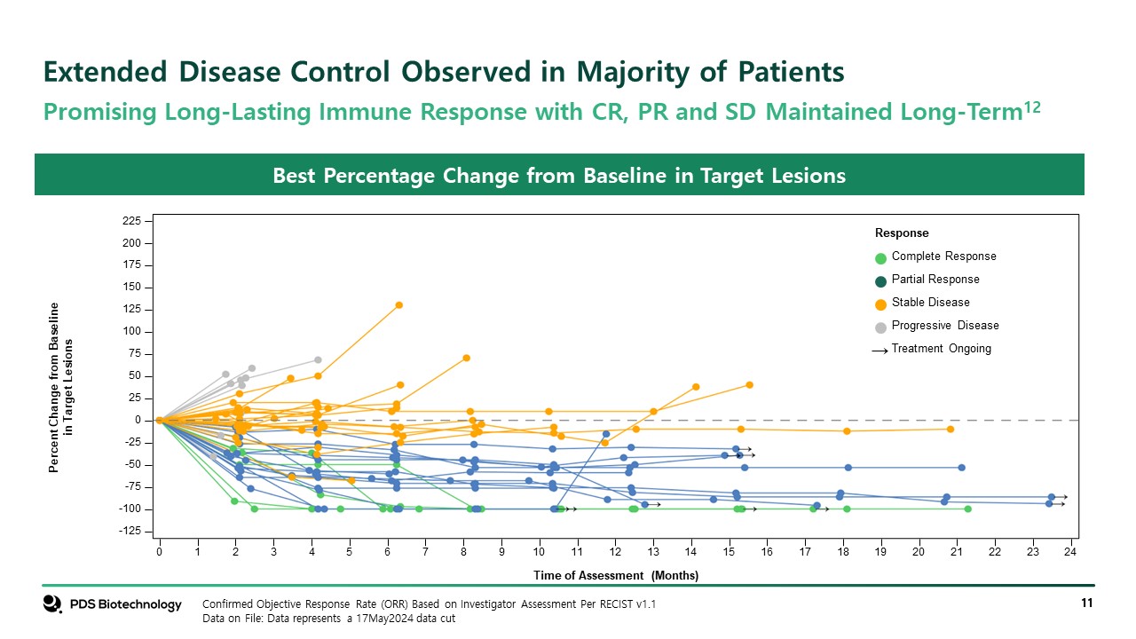 Extended Disease Control Observed in Majority of Patients  Confirmed Objective Response Rate (ORR) Based on Investigator Assessment Per RECIST v1.1  Data on File: Data represents a 17May2024 data cut  Best Percentage Change from Baseline in Target Lesions  Promising Long-Lasting Immune Response with CR, PR and SD Maintained Long-Term12  Percent Change from Baselinein Target Lesions  Time of Assessment (Months)  0  2  4  6  8  10  12  14  16  18  20  22  24  1  3  5  7  9  11  13  15  17  19  21  23  -125  -100  150  175  200  225  50  75  100  125  -50  -25  0  25  -75  Response  Complete Response  Partial Response  Stable Disease  Progressive Disease  Treatment Ongoing