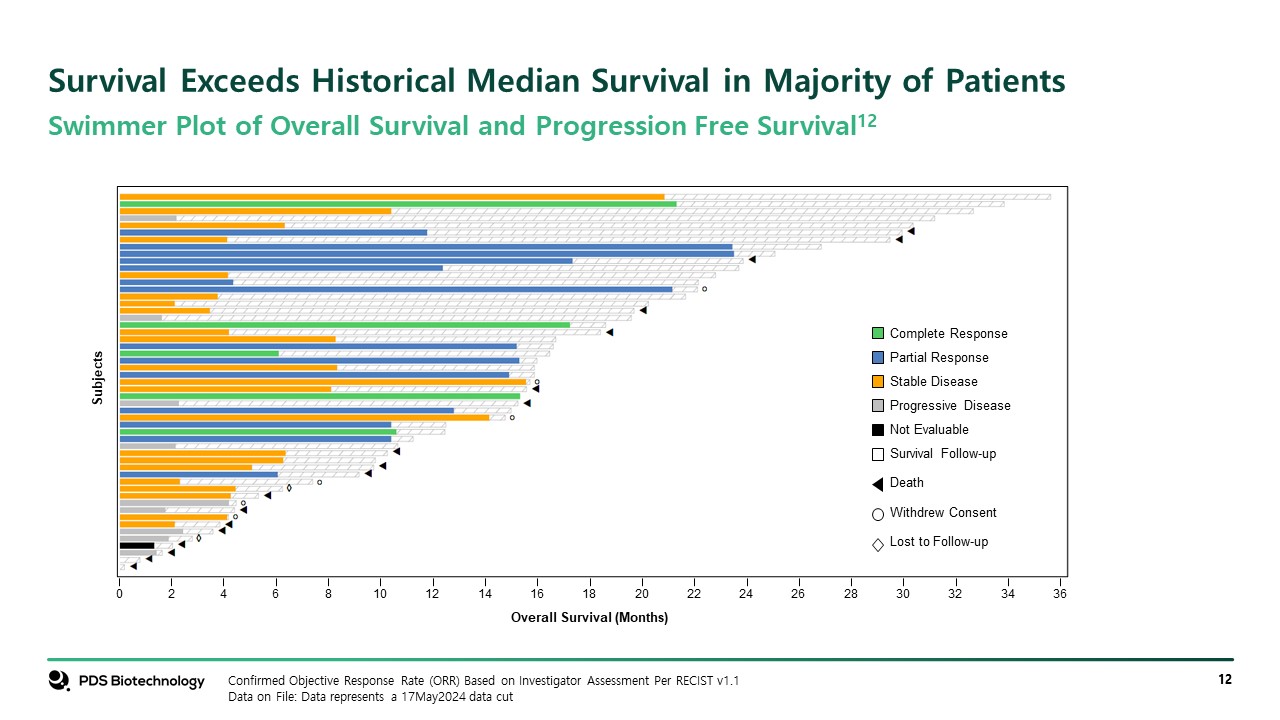 Survival Exceeds Historical Median Survival in Majority of Patients  Confirmed Objective Response Rate (ORR) Based on Investigator Assessment Per RECIST v1.1  Data on File: Data represents a 17May2024 data cut  Swimmer Plot of Overall Survival and Progression Free Survival12  Subjects  0  2  4  6  8  10  12  14  16  18  20  22  24  26  28  30  32  34  36  Overall Survival (Months)  Complete Response  Partial Response  Stable Disease  Progressive Disease  Not Evaluable  Survival Follow-up  Death  Withdrew Consent  Lost to Follow-up