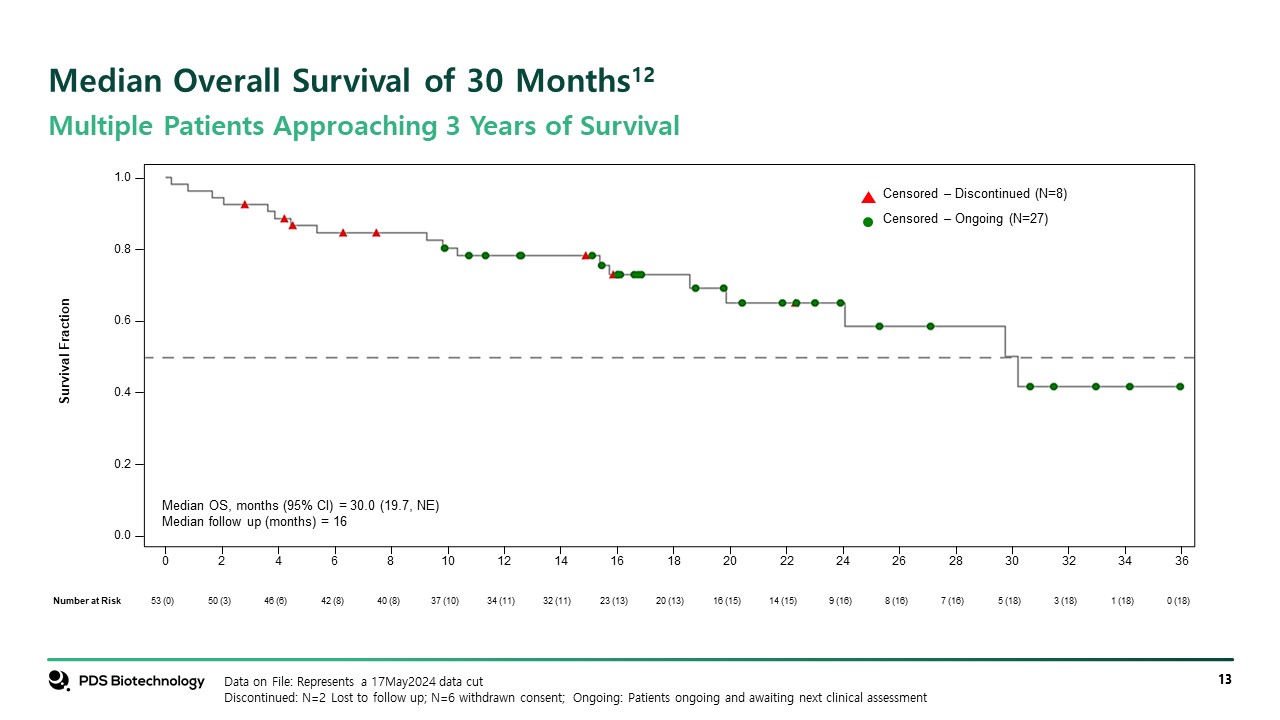 Survival Fraction  0  2  4  6  8  10  12  14  16  18  20  22  24  26  28  30  32  34  36  0.0  0.2  0.4  0.6  0.8  1.0  Censored ‒ Ongoing (N=27)  Censored ‒ Discontinued (N=8)  Data on File: Represents a 17May2024 data cut  Discontinued: N=2 Lost to follow up; N=6 withdrawn consent; Ongoing: Patients ongoing and awaiting next clinical assessment  Median Overall Survival of 30 Months12  Multiple Patients Approaching 3 Years of Survival      53 (0)  50 (3)  46 (6)  42 (8)  40 (8)  37 (10)  34 (11)  32 (11)  23 (13)  20 (13)  16 (15)  14 (15)  9 (16)  8 (16)  7 (16)  5 (18)  3 (18)  1 (18)  0 (18)  Number at Risk  Median OS, months (95% CI) = 30.0 (19.7, NE)  Median follow up (months) = 16