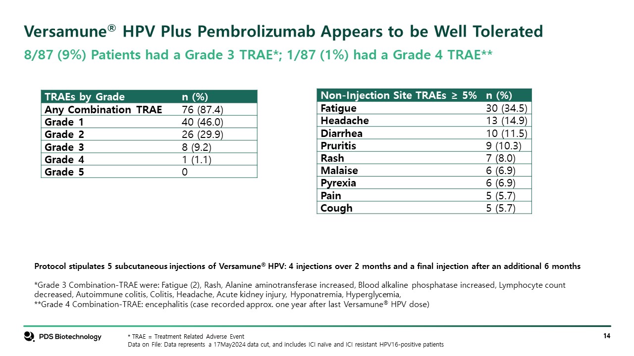Versamune® HPV Plus Pembrolizumab Appears to be Well Tolerated   Protocol stipulates 5 subcutaneous injections of Versamune® HPV: 4 injections over 2 months and a final injection after an additional 6 months  *Grade 3 Combination-TRAE were: Fatigue (2), Rash, Alanine aminotransferase increased, Blood alkaline phosphatase increased, Lymphocyte count decreased, Autoimmune colitis, Colitis, Headache, Acute kidney injury, Hyponatremia, Hyperglycemia,   **Grade 4 Combination-TRAE: encephalitis (case recorded approx. one year after last Versamune® HPV dose)  * TRAE = Treatment Related Adverse Event  Data on File: Data represents a 17May2024 data cut, and includes ICI naïve and ICI resistant HPV16-positive patients  8/87 (9%) Patients had a Grade 3 TRAE*; 1/87 (1%) had a Grade 4 TRAE**   TRAEs by Grade  n (%)  Any Combination TRAE  76 (87.4)  Grade 1  40 (46.0)  Grade 2  26 (29.9)  Grade 3  8 (9.2)  Grade 4  1 (1.1)  Grade 5  0  Non-Injection Site TRAEs ≥ 5%  n (%)  Fatigue  30 (34.5)  Headache  13 (14.9)  Diarrhea  10 (11.5)  Pruritis  9 (10.3)  Rash  7 (8.0)  Malaise  6 (6.9)  Pyrexia  6 (6.9)  Pain  5 (5.7)  Cough  5 (5.7)