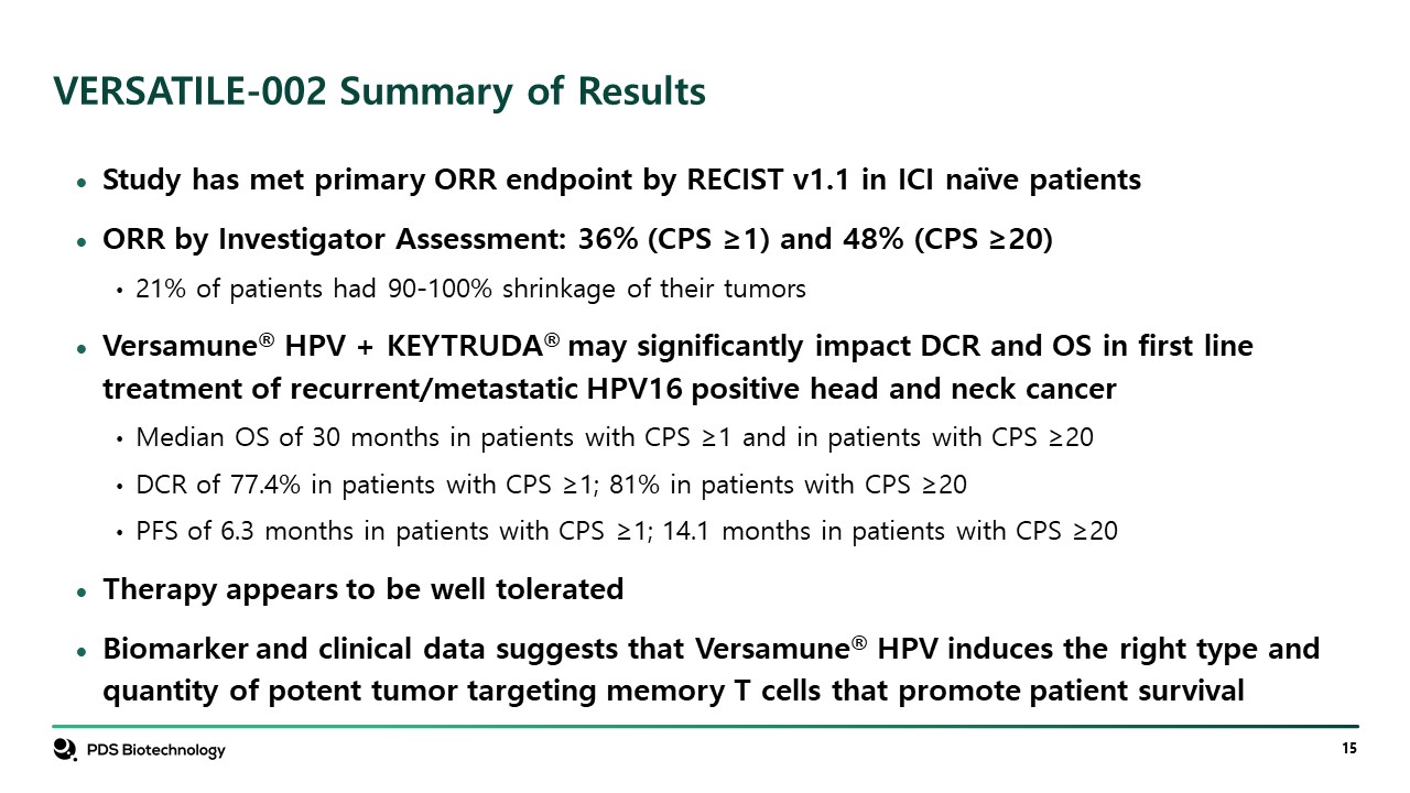 VERSATILE-002 Summary of Results  Study has met primary ORR endpoint by RECIST v1.1 in ICI naïve patients  ORR by Investigator Assessment: 36% (CPS ≥1) and 48% (CPS ≥20)  21% of patients had 90-100% shrinkage of their tumors  Versamune® HPV + KEYTRUDA® may significantly impact DCR and OS in first line treatment of recurrent/metastatic HPV16 positive head and neck cancer  Median OS of 30 months in patients with CPS ≥1 and in patients with CPS ≥20  DCR of 77.4% in patients with CPS ≥1; 81% in patients with CPS ≥20  PFS of 6.3 months in patients with CPS ≥1; 14.1 months in patients with CPS ≥20  Therapy appears to be well tolerated  Biomarker and clinical data suggests that Versamune® HPV induces the right type and quantity of potent tumor targeting memory T cells that promote patient survival