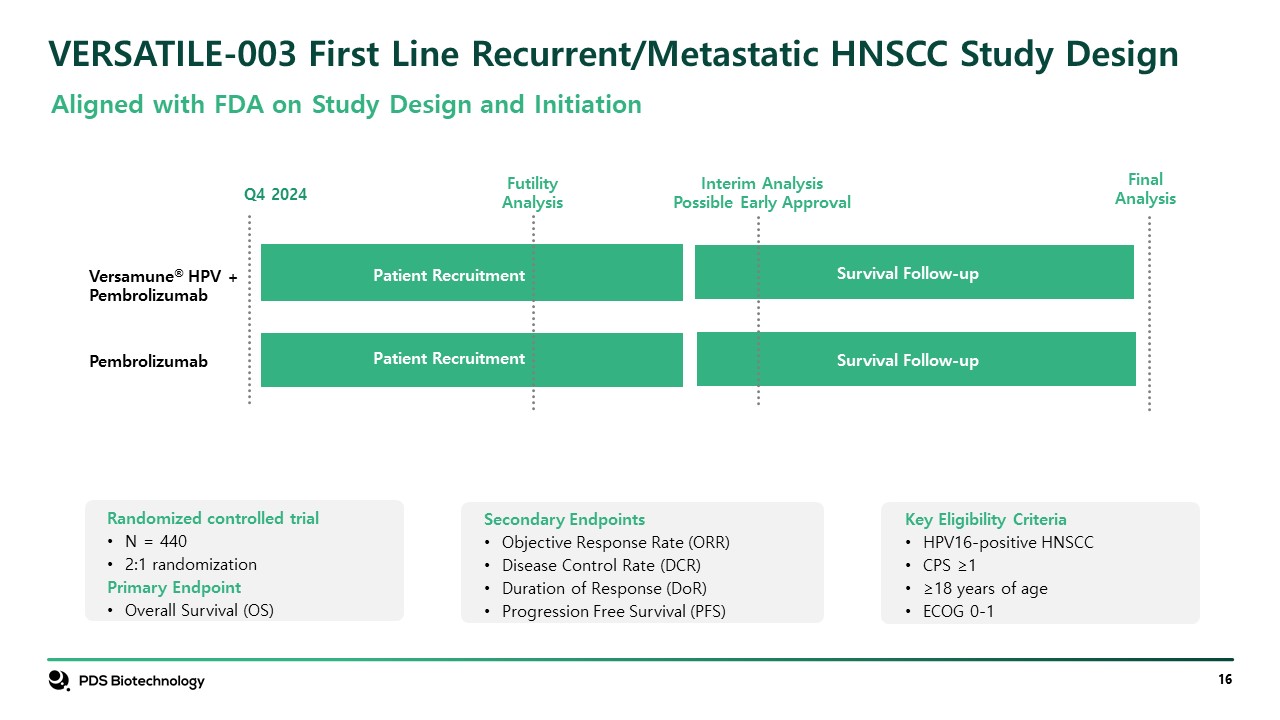 VERSATILE-003 First Line Recurrent/Metastatic HNSCC Study Design  Interim Analysis  Possible Early Approval  Versamune® HPV + PDS01ADC + pembrolizumab  Q4 2024  Versamune® HPV + Pembrolizumab  Pembrolizumab  Aligned with FDA on Study Design and Initiation  Patient Recruitment  Patient Recruitment  Survival Follow-up  Survival Follow-up  Key Eligibility Criteria  HPV16-positive HNSCC  CPS ≥1  ≥18 years of age  ECOG 0-1  Secondary Endpoints  Objective Response Rate (ORR)  Disease Control Rate (DCR)  Duration of Response (DoR)  Progression Free Survival (PFS)  Randomized controlled trial  N = 440  2:1 randomization  Primary Endpoint  Overall Survival (OS)  FinalAnalysis  FutilityAnalysis