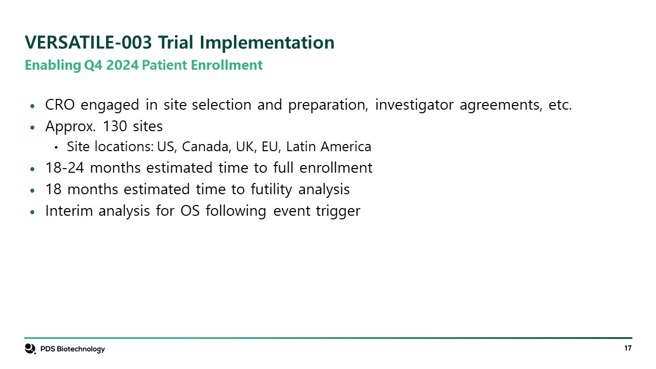 Enabling Q4 2024 Patient Enrollment  CRO engaged in site selection and preparation, investigator agreements, etc.  Approx. 130 sites  Site locations: US, Canada, UK, EU, Latin America  18-24 months estimated time to full enrollment  18 months estimated time to futility analysis   Interim analysis for OS following event trigger  VERSATILE-003 Trial Implementation
