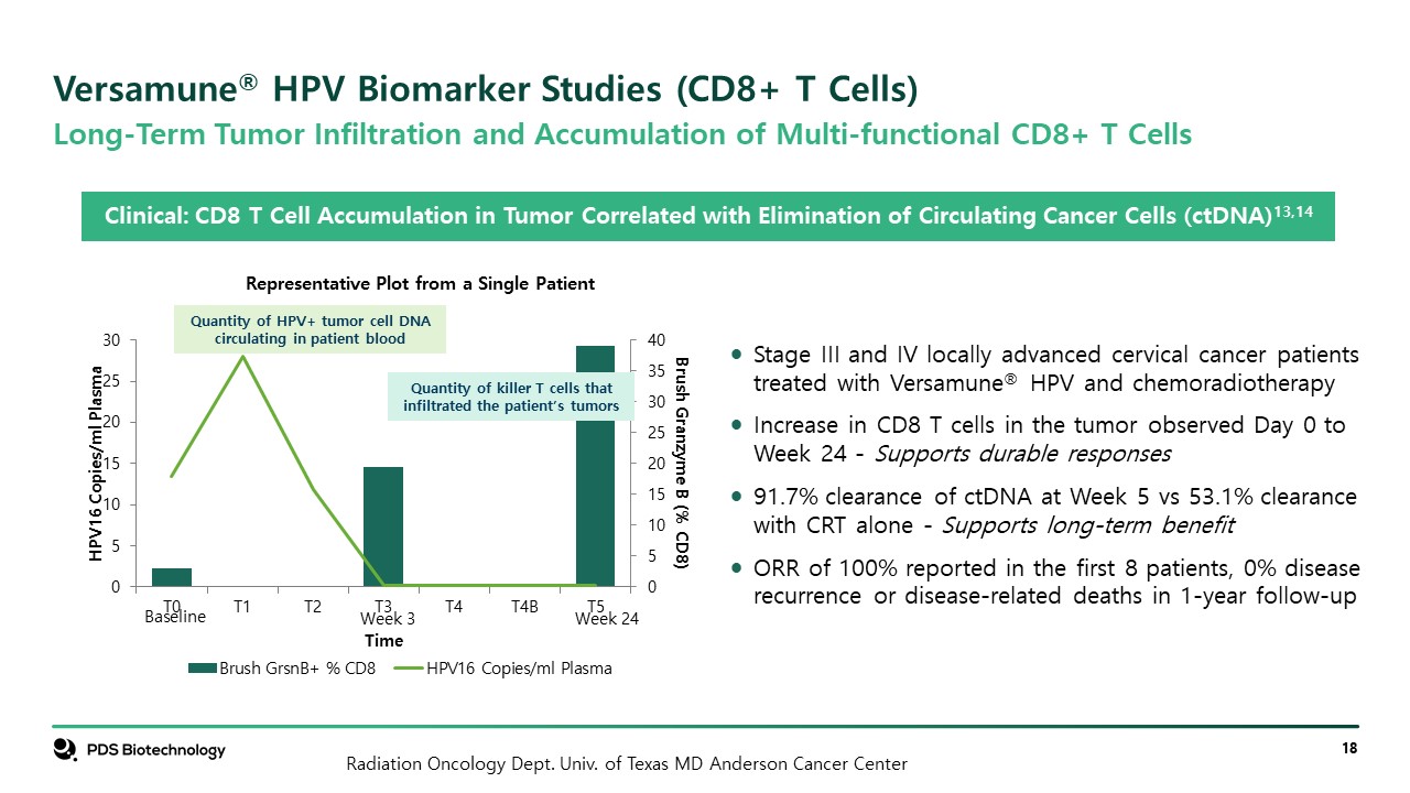 Versamune® HPV Biomarker Studies (CD8+ T Cells)  Stage III and IV locally advanced cervical cancer patients treated with Versamune® HPV and chemoradiotherapy  Increase in CD8 T cells in the tumor observed Day 0 to Week 24 - Supports durable responses  91.7% clearance of ctDNA at Week 5 vs 53.1% clearance with CRT alone - Supports long-term benefit  ORR of 100% reported in the first 8 patients, 0% disease recurrence or disease-related deaths in 1-year follow-up  Quantity of killer T cells that infiltrated the patient’s tumors  Quantity of HPV+ tumor cell DNA circulating in patient blood  Clinical: CD8 T Cell Accumulation in Tumor Correlated with Elimination of Circulating Cancer Cells (ctDNA)13,14  Long-Term Tumor Infiltration and Accumulation of Multi-functional CD8+ T Cells  Representative Plot from a Single Patient  Week 24  Week 3  Baseline  Radiation Oncology Dept. Univ. of Texas MD Anderson Cancer Center