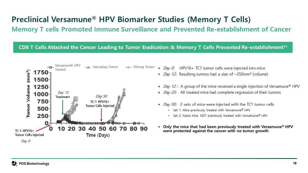 Day 0: HPV16+ TC1 tumor cells were injected into mice  Day 12: Resulting tumors had a size of ~250mm3 (volume)  Day 12 : A group of the mice received a single injection of Versamune® HPV   Day 25: All treated mice had complete regression of their tumors  Day 50: 2 sets of mice were injected with the TC1 tumor cells  Set 1: Mice previously treated with Versamune® HPV  Set 2: Naïve mice NOT previously treated with Versamune® HPV  Only the mice that had been previously treated with Versamune® HPV were protected against the cancer with no tumor growth  CD8 T Cells Attacked the Cancer Leading to Tumor Eradication & Memory T Cells Prevented Re-establishment15  Memory T cells Promoted Immune Surveillance and Prevented Re-establishment of Cancer   Day 0  Day 12  Day 50  Preclinical Versamune® HPV Biomarker Studies (Memory T Cells)