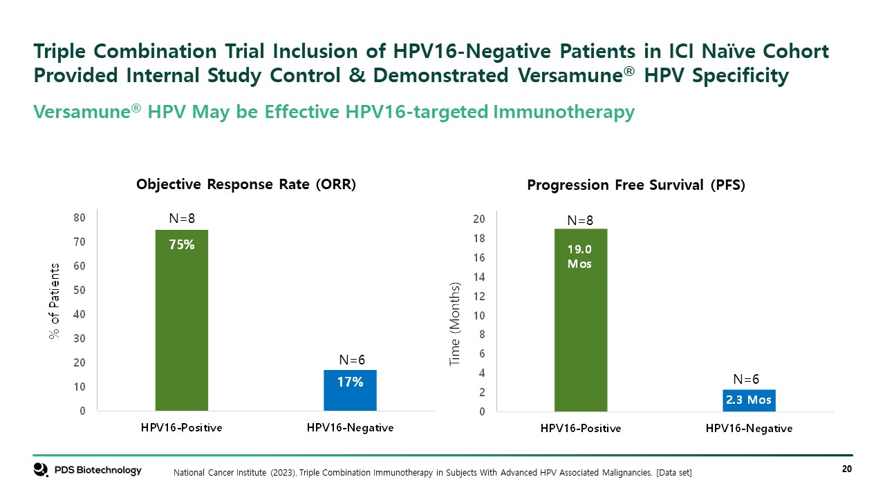 Triple Combination Trial Inclusion of HPV16-Negative Patients in ICI Naïve Cohort Provided Internal Study Control & Demonstrated Versamune® HPV Specificity  National Cancer Institute (2023). Triple Combination Immunotherapy in Subjects With Advanced HPV Associated Malignancies. [Data set]  Objective Response Rate (ORR)  Progression Free Survival (PFS)  Versamune® HPV May be Effective HPV16-targeted Immunotherapy  N=8  N=8  N=6  N=6