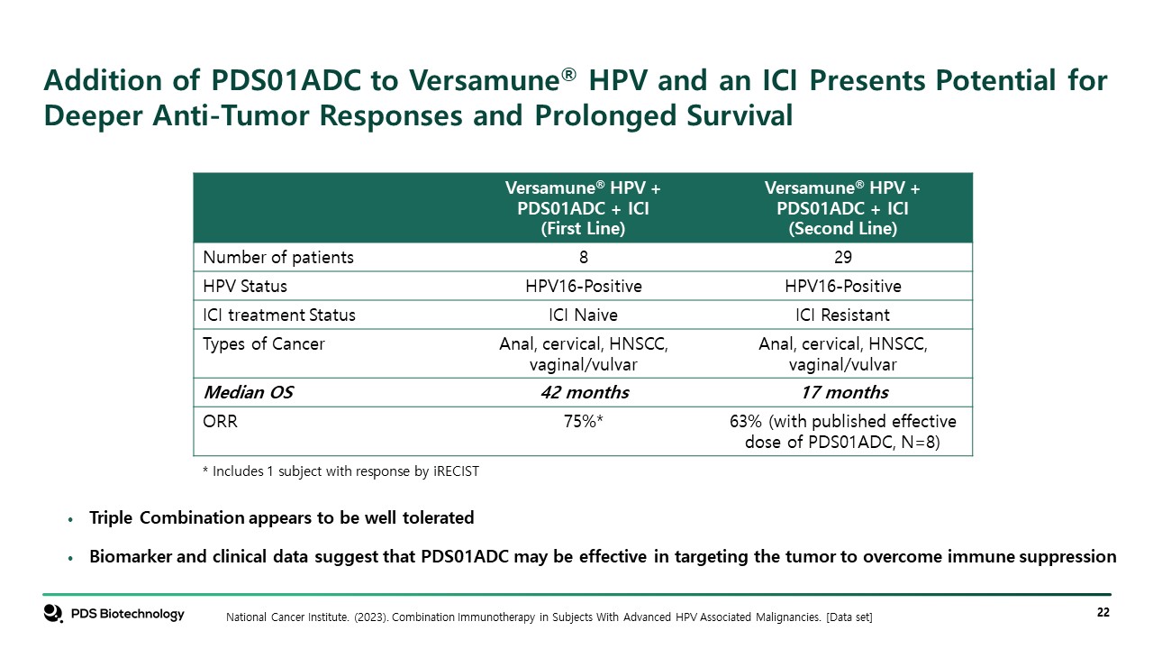 Addition of PDS01ADC to Versamune® HPV and an ICI Presents Potential for Deeper Anti-Tumor Responses and Prolonged Survival  Versamune® HPV + PDS01ADC + ICI  (First Line)  Versamune® HPV + PDS01ADC + ICI  (Second Line)  Number of patients  8  29  HPV Status  HPV16-Positive  HPV16-Positive  ICI treatment Status  ICI Naive  ICI Resistant  Types of Cancer  Anal, cervical, HNSCC, vaginal/vulvar  Anal, cervical, HNSCC, vaginal/vulvar  Median OS   42 months  17 months  ORR  75%*  63% (with published effective dose of PDS01ADC, N=8)  Triple Combination appears to be well tolerated   Biomarker and clinical data suggest that PDS01ADC may be effective in targeting the tumor to overcome immune suppression  National Cancer Institute. (2023). Combination Immunotherapy in Subjects With Advanced HPV Associated Malignancies. [Data set]  * Includes 1 subject with response by iRECIST