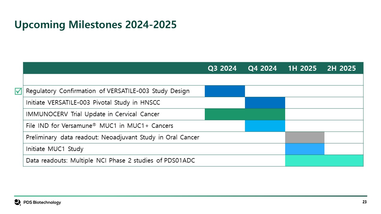Upcoming Milestones 2024-2025  Q3 2024  Q4 2024  1H 2025  2H 2025  Regulatory Confirmation of VERSATILE-003 Study Design  Initiate VERSATILE-003 Pivotal Study in HNSCC  IMMUNOCERV Trial Update in Cervical Cancer  File IND for Versamune® MUC1 in MUC1+ Cancers  Preliminary data readout: Neoadjuvant Study in Oral Cancer  Initiate MUC1 Study  Data readouts: Multiple NCI Phase 2 studies of PDS01ADC  þ