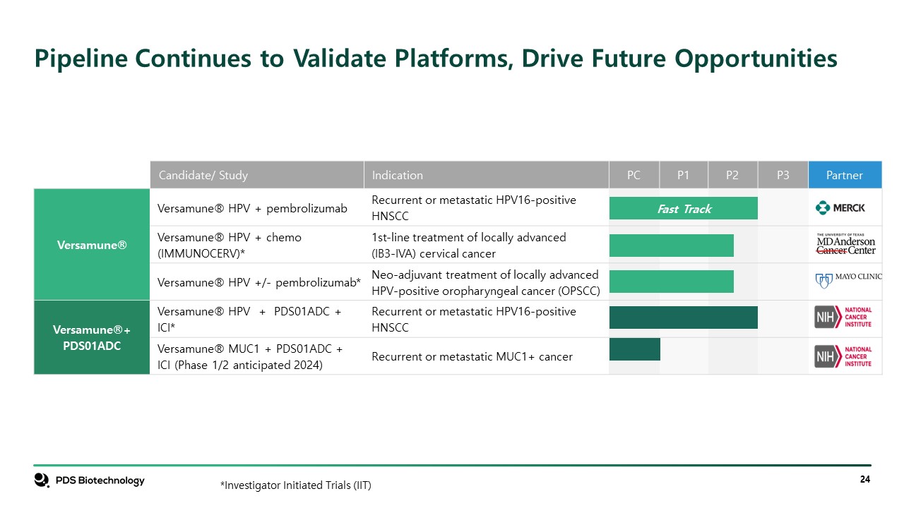 Candidate/ Study   Indication  PC  P1  P2  P3  Partner  Versamune®  Versamune® HPV + pembrolizumab  Recurrent or metastatic HPV16-positive HNSCC  Versamune® HPV + chemo (IMMUNOCERV)*  1st-line treatment of locally advanced(IB3-IVA) cervical cancer  Versamune® HPV +/- pembrolizumab*   Neo-adjuvant treatment of locally advanced HPV-positive oropharyngeal cancer (OPSCC)  Versamune®+PDS01ADC  Versamune® HPV + PDS01ADC + ICI*   Recurrent or metastatic HPV16-positive HNSCC  Versamune® MUC1 + PDS01ADC + ICI (Phase 1/2 anticipated 2024)  Recurrent or metastatic MUC1+ cancer  Pipeline Continues to Validate Platforms, Drive Future Opportunities  Fast Track  *Investigator Initiated Trials (IIT)