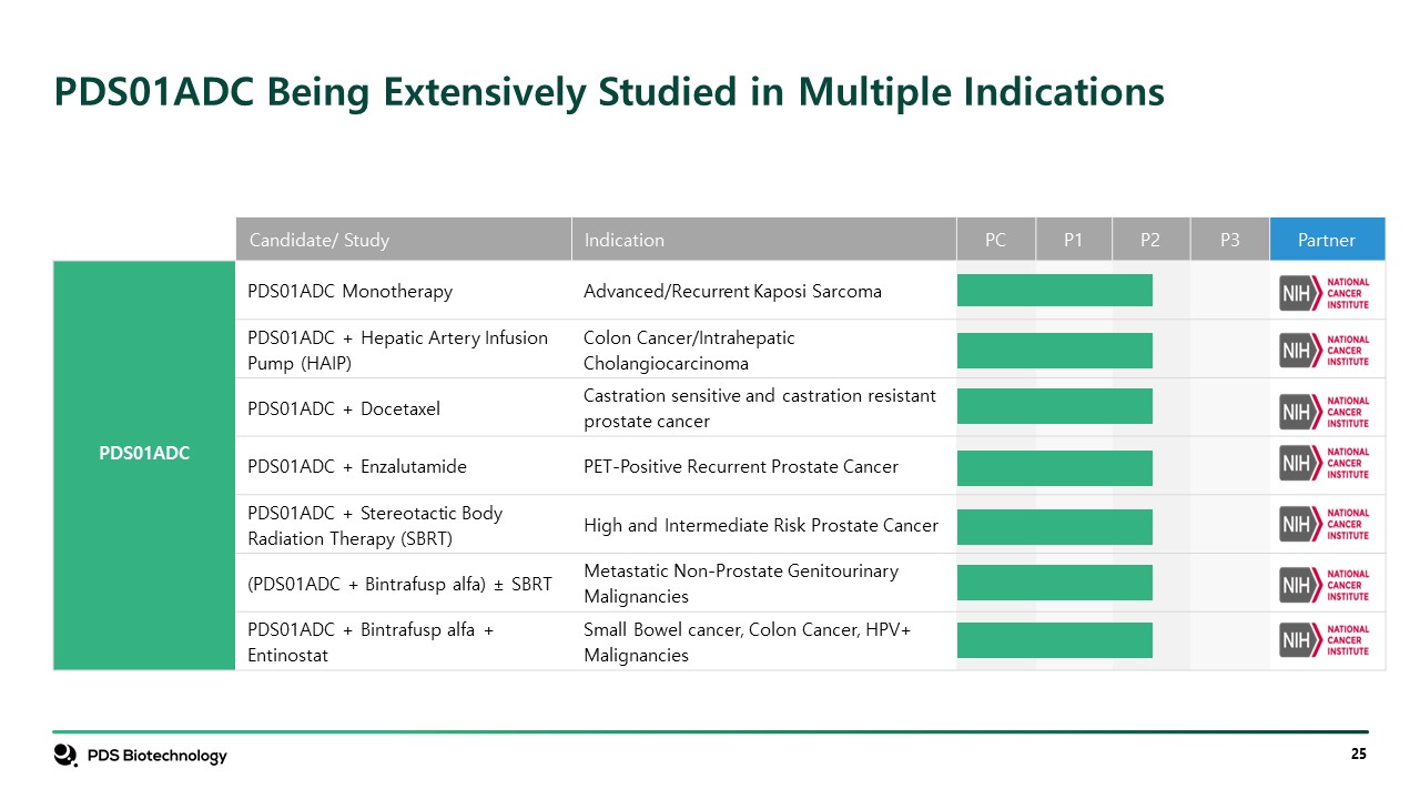 Candidate/ Study   Indication  PC  P1  P2  P3  Partner  PDS01ADC  PDS01ADC Monotherapy  Advanced/Recurrent Kaposi Sarcoma  PDS01ADC + Hepatic Artery Infusion Pump (HAIP)  Colon Cancer/Intrahepatic Cholangiocarcinoma  PDS01ADC + Docetaxel  Castration sensitive and castration resistant prostate cancer  PDS01ADC + Enzalutamide  PET-Positive Recurrent Prostate Cancer  PDS01ADC + Stereotactic Body Radiation Therapy (SBRT)  High and Intermediate Risk Prostate Cancer  (PDS01ADC + Bintrafusp alfa) ± SBRT  Metastatic Non-Prostate Genitourinary Malignancies  PDS01ADC + Bintrafusp alfa + Entinostat  Small Bowel cancer, Colon Cancer, HPV+ Malignancies  PDS01ADC Being Extensively Studied in Multiple Indications