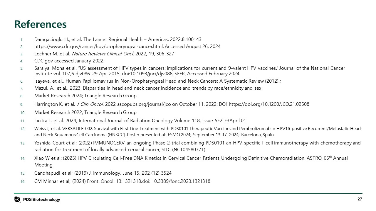 References  Damgacioglu H., et al. The Lancet Regional Health – Americas. 2022;8:100143   https://www.cdc.gov/cancer/hpv/oropharyngeal-cancer.html. Accessed August 26, 2024   Lechner M. et al. Nature Reviews Clinical Oncl. 2022, 19, 306-327  CDC.gov accessed January 2022;  Saraiya, Mona et al. “US assessment of HPV types in cancers: implications for current and 9-valent HPV vaccines.” Journal of the National Cancer Institute vol. 107,6 djv086. 29 Apr. 2015, doi:10.1093/jnci/djv086; SEER, Accessed February 2024  Isayeva, et al., Human Papillomavirus in Non-Oropharyngeal Head and Neck Cancers: A Systematic Review (2012).;   Mazul, A., et al., 2023, Disparities in head and neck cancer incidence and trends by race/ethnicity and sex  Market Research 2024; Triangle Research Group  Harrington K. et al. J Clin Oncol. 2022 ascopubs.org/journal/jco on October 11, 2022: DOI https://doi.org/10.1200/JCO.21.02508  Market Research 2022; Triangle Research Group  Licitra L. et al. 2024, International Journal of Radiation Oncology Volume 118, Issue 5e2-e3April 01  Weiss J, et al. VERSATILE-002: Survival with First-Line Treatment with PDS0101 Therapeutic Vaccine and Pembrolizumab in HPV16-positive Recurrent/Metastatic Head and Neck Squamous Cell Carcinoma (HNSCC). Poster presented at: ESMO 2024; September 13-17, 2024; Barcelona, Spain.  Yoshida-Court et al: (2022) IMMUNOCERV an ongoing Phase 2 trial combining PDS0101 an HPV-specific T cell immunotherapy with chemotherapy and radiation for treatment of locally advanced cervical cancer, SITC (NCT04580771)  Xiao W et al: (2023) HPV Circulating Cell-Free DNA Kinetics in Cervical Cancer Patients Undergoing Definitive Chemoradiation, ASTRO, 65th Annual Meeting  Gandhapudi et al; (2019) J. Immunology, June 15, 202 (12) 3524   CM Minnar et al; (2024) Front. Oncol. 13:1321318.doi: 10.3389/fonc.2023.1321318