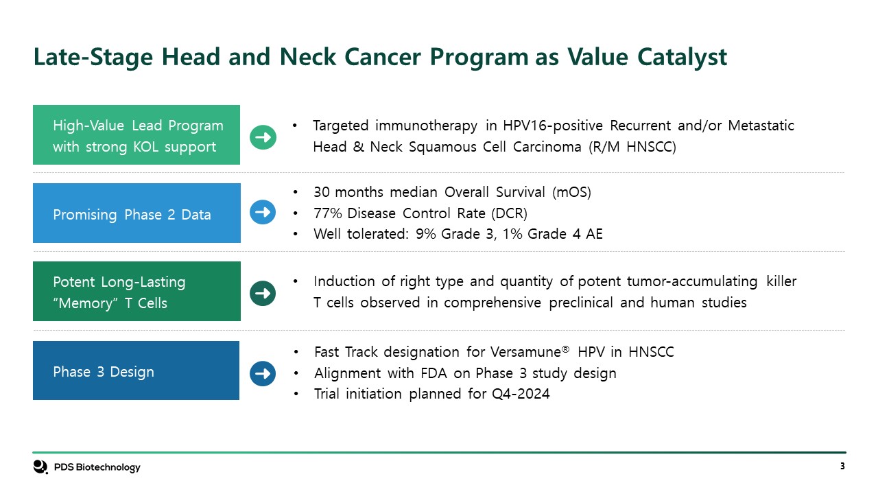 Late-Stage Head and Neck Cancer Program as Value Catalyst  Potent Long-Lasting “Memory” T Cells  High-Value Lead Program with strong KOL support  Promising Phase 2 Data  Phase 3 Design  30 months median Overall Survival (mOS)  77% Disease Control Rate (DCR)  Well tolerated: 9% Grade 3, 1% Grade 4 AE  Targeted immunotherapy in HPV16-positive Recurrent and/or Metastatic Head & Neck Squamous Cell Carcinoma (R/M HNSCC)  Fast Track designation for Versamune® HPV in HNSCC  Alignment with FDA on Phase 3 study design  Trial initiation planned for Q4-2024  Induction of right type and quantity of potent tumor-accumulating killer T cells observed in comprehensive preclinical and human studies