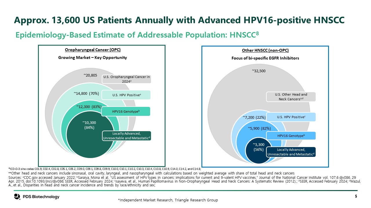 Approx. 13,600 US Patients Annually with Advanced HPV16-positive HNSCC  Epidemiology-Based Estimate of Addressable Population: HNSCC8  U.S. Other Head and   Neck Cancersa,d  U.S. HPV Positivec  HPV16 Genotypeb  Locally Advanced, Unresectable and Metastaticd  ~3,300 (56%)  ~5,900 (82%)  ~7,200 (22%)  ~32,500  U.S. Oropharyngeal Cancer in 2024a   U.S. HPV Positivea  HPV16 Genotypeb  Locally Advanced, Unresectable and Metastaticd  ~10,300 (84%)  ~12,300 (83%)  ~14,800 (70%)  ~20,805  Oropharyngeal Cancer (OPC)  Growing Market – Key Opportunity  Other HNSCC (non-OPC)  Focus of bi-specific EGFR Inhibitors  *ICD-O-3 site codes C01.9, C02.4, C02.8, C05.1, C05.2, C09.0, C09.1, C09.8, C09.9, C10.0, C10.1, C10.2, C10.3, C10.4, C10.8, C10.9, C14.0, C14.2, and C14.8;   **Other head and neck cancers include sinonasal, oral cavity, laryngeal, and nasopharyngeal with calculations based on weighted average with share of total head and neck cancers  Sources: aCDC.gov accessed January 2022; bSaraiya, Mona et al. “US assessment of HPV types in cancers: implications for current and 9-valent HPV vaccines.” Journal of the National Cancer Institute vol. 107,6 djv086. 29 Apr. 2015, doi:10.1093/jnci/djv086; SEER, Accessed February 2024; cIsayeva, et al., Human Papillomavirus in Non-Oropharyngeal Head and Neck Cancers: A Systematic Review (2012).; dSEER, Accessed February 2024; dMazul, A., et al., Disparities in head and neck cancer incidence and trends by race/ethnicity and sex;   *Independent Market Research, Triangle Research Group