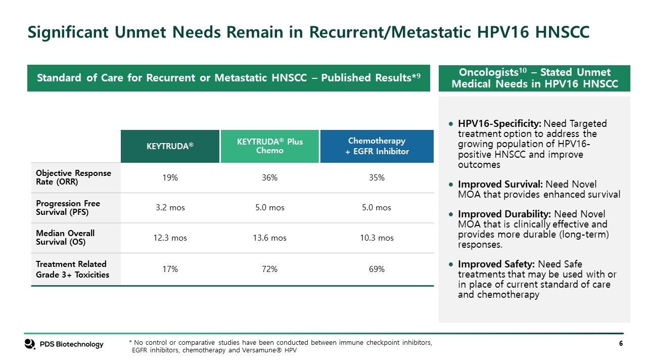 Significant Unmet Needs Remain in Recurrent/Metastatic HPV16 HNSCC   KEYTRUDA®  KEYTRUDA® Plus Chemo  Chemotherapy   + EGFR Inhibitor  Objective Response Rate (ORR)  19%  36%  35%  Progression Free Survival (PFS)  3.2 mos  5.0 mos  5.0 mos  Median Overall Survival (OS)  12.3 mos  13.6 mos  10.3 mos  Treatment Related   Grade 3+ Toxicities  17%  72%  69%  HPV16-Specificity: Need Targeted treatment option to address the growing population of HPV16-positive HNSCC and improve outcomes   Improved Survival: Need Novel MOA that provides enhanced survival  Improved Durability: Need Novel MOA that is clinically effective and provides more durable (long-term) responses.   Improved Safety: Need Safe treatments that may be used with or in place of current standard of care and chemotherapy  Oncologists10 – Stated Unmet Medical Needs in HPV16 HNSCC  * No control or comparative studies have been conducted between immune checkpoint inhibitors, EGFR inhibitors, chemotherapy and Versamune® HPV  Standard of Care for Recurrent or Metastatic HNSCC – Published Results*9