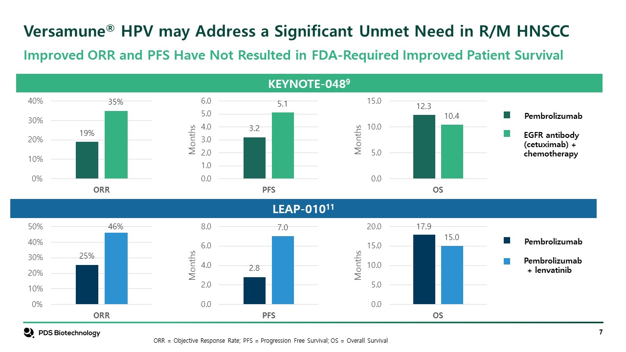 Versamune® HPV may Address a Significant Unmet Need in R/M HNSCC  KEYNOTE-0489  Pembrolizumab  EGFR antibody (cetuximab) + chemotherapy  LEAP-01011  Pembrolizumab  Pembrolizumab   + lenvatinib  Improved ORR and PFS Have Not Resulted in FDA-Required Improved Patient Survival  ORR = Objective Response Rate; PFS = Progression Free Survival; OS = Overall Survival
