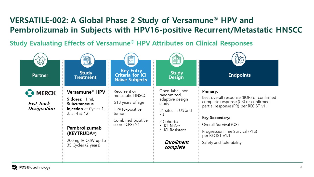 VERSATILE-002: A Global Phase 2 Study of Versamune® HPV and Pembrolizumab in Subjects with HPV16-positive Recurrent/Metastatic HNSCC  Partner  StudyDesign  Open-label, non-randomized, adaptive design study  31 sites in US and EU  2 Cohorts:   ICI Naïve  ICI Resistant  Enrollment complete  Key Entry Criteria for ICI Naïve Subjects  Recurrent or metastatic HNSCC  ≥18 years of age  HPV16-positive tumor  Combined positive score (CPS) ≥1  Versamune® HPV  5 doses: 1 mL Subcutaneous injection at Cycles 1, 2, 3, 4 & 12)  Pembrolizumab (KEYTRUDA®)   200mg IV Q3W up to 35 Cycles (2 years)  Study Treatment  Primary:  Best overall response (BOR) of confirmed complete response (CR) or confirmed partial response (PR) per RECIST v1.1  Key Secondary:  Overall Survival (OS)  Progression Free Survival (PFS) per RECIST v1.1   Safety and tolerability  Endpoints  Fast Track Designation  Study Evaluating Effects of Versamune® HPV Attributes on Clinical Responses