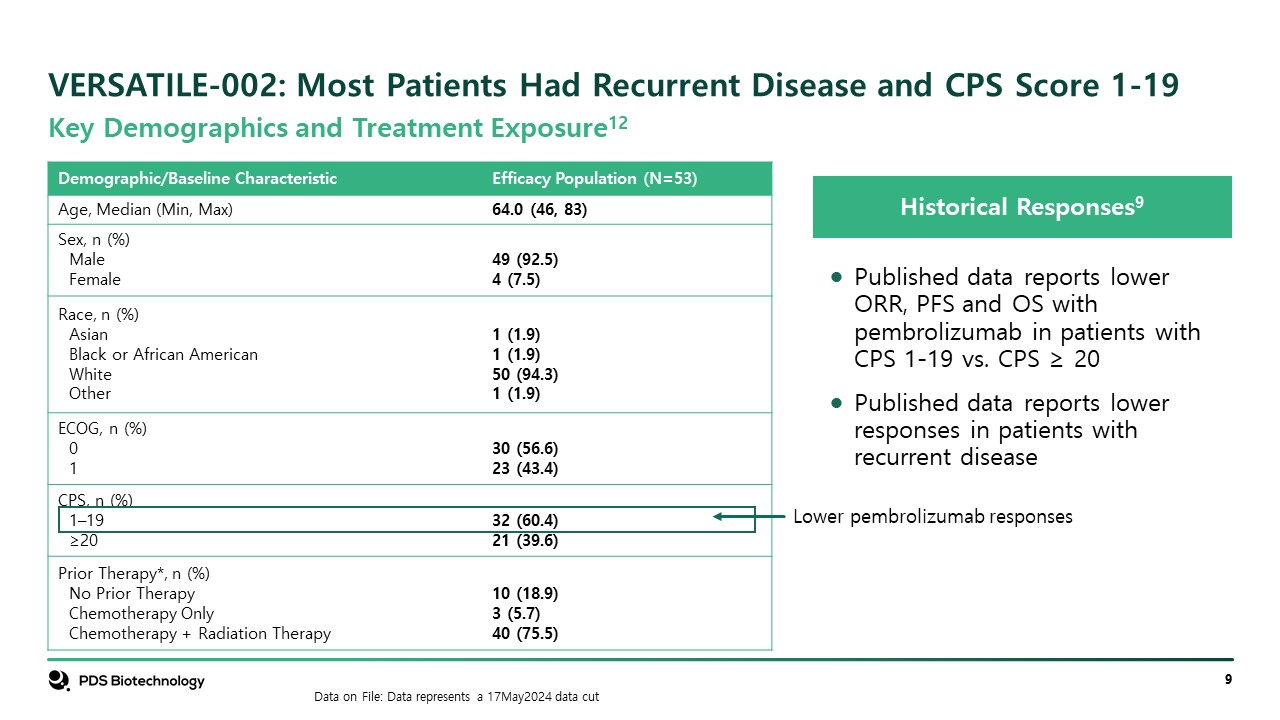 VERSATILE-002: Most Patients Had Recurrent Disease and CPS Score 1-19  Historical Responses9  Published data reports lower ORR, PFS and OS with pembrolizumab in patients with CPS 1-19 vs. CPS ≥ 20  Published data reports lower responses in patients with recurrent disease  Data on File: Data represents a 17May2024 data cut  Key Demographics and Treatment Exposure12  Demographic/Baseline Characteristic  Efficacy Population (N=53)  Age, Median (Min, Max)  64.0 (46, 83)  Sex, n (%)  Male  Female     49 (92.5)  4 (7.5)  Race, n (%)  Asian  Black or African American  White  Other     1 (1.9)  1 (1.9)  50 (94.3)  1 (1.9)  ECOG, n (%)  0  1     30 (56.6)  23 (43.4)  CPS, n (%)  1–19  ≥20     32 (60.4)  21 (39.6)  Prior Therapy*, n (%)   No Prior Therapy  Chemotherapy Only  Chemotherapy + Radiation Therapy     10 (18.9)  3 (5.7)  40 (75.5)  Lower pembrolizumab responses