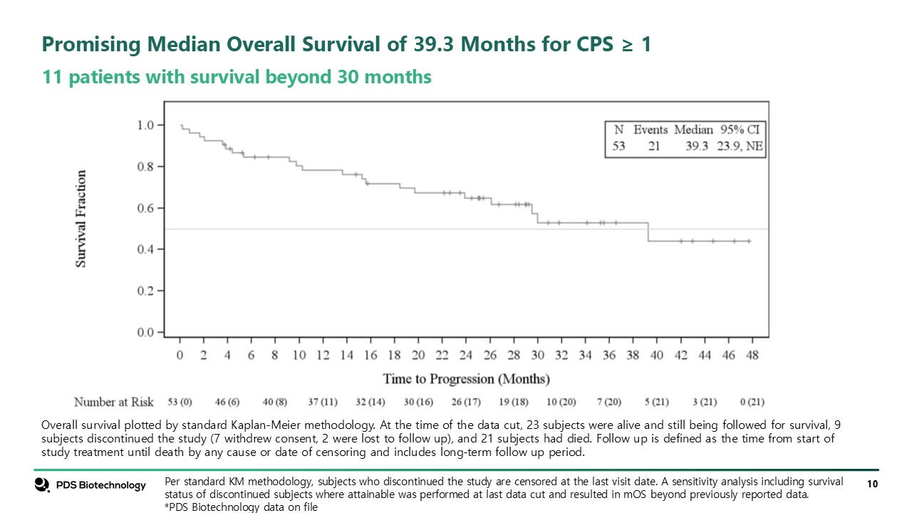 Promising Median Overall Survival of 39.3 Months for CPS ≥ 1  11 patients with survival beyond 30 months  Per standard KM methodology, subjects who discontinued the study are censored at the last visit date. A sensitivity analysis including survival status of discontinued subjects where attainable was performed at last data cut and resulted in mOS beyond previously reported data.  *PDS Biotechnology data on file  Overall survival plotted by standard Kaplan-Meier methodology. At the time of the data cut, 23 subjects were alive and still being followed for survival, 9 subjects discontinued the study (7 withdrew consent, 2 were lost to follow up), and 21 subjects had died. Follow up is defined as the time from start of study treatment until death by any cause or date of censoring and includes long-term follow up period.