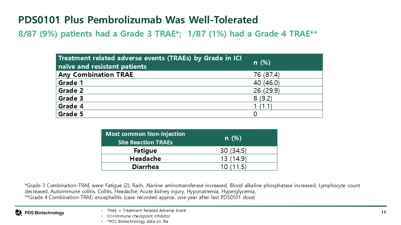 PDS0101 Plus Pembrolizumab Was Well-Tolerated   *Grade 3 Combination-TRAE were: Fatigue (2), Rash, Alanine aminotransferase increased, Blood alkaline phosphatase increased, Lymphocyte count decreased, Autoimmune colitis, Colitis, Headache, Acute kidney injury, Hyponatremia, Hyperglycemia,   **Grade 4 Combination-TRAE: encephalitis (case recorded approx. one year after last PDS0101 dose)  TRAE = Treatment Related Adverse Event  ICI=Immune checkpoint inhibitor  *PDS Biotechnology data on file  8/87 (9%) patients had a Grade 3 TRAE*; 1/87 (1%) had a Grade 4 TRAE**   Treatment related adverse events (TRAEs) by Grade in ICI naïve and resistant patients  n (%)  Any Combination TRAE  76 (87.4)  Grade 1  40 (46.0)  Grade 2  26 (29.9)  Grade 3  8 (9.2)  Grade 4  1 (1.1)  Grade 5  0  Most common Non-Injection Site Reaction TRAEs  n (%)  Fatigue  30 (34.5)  Headache  13 (14.9)  Diarrhea  10 (11.5)